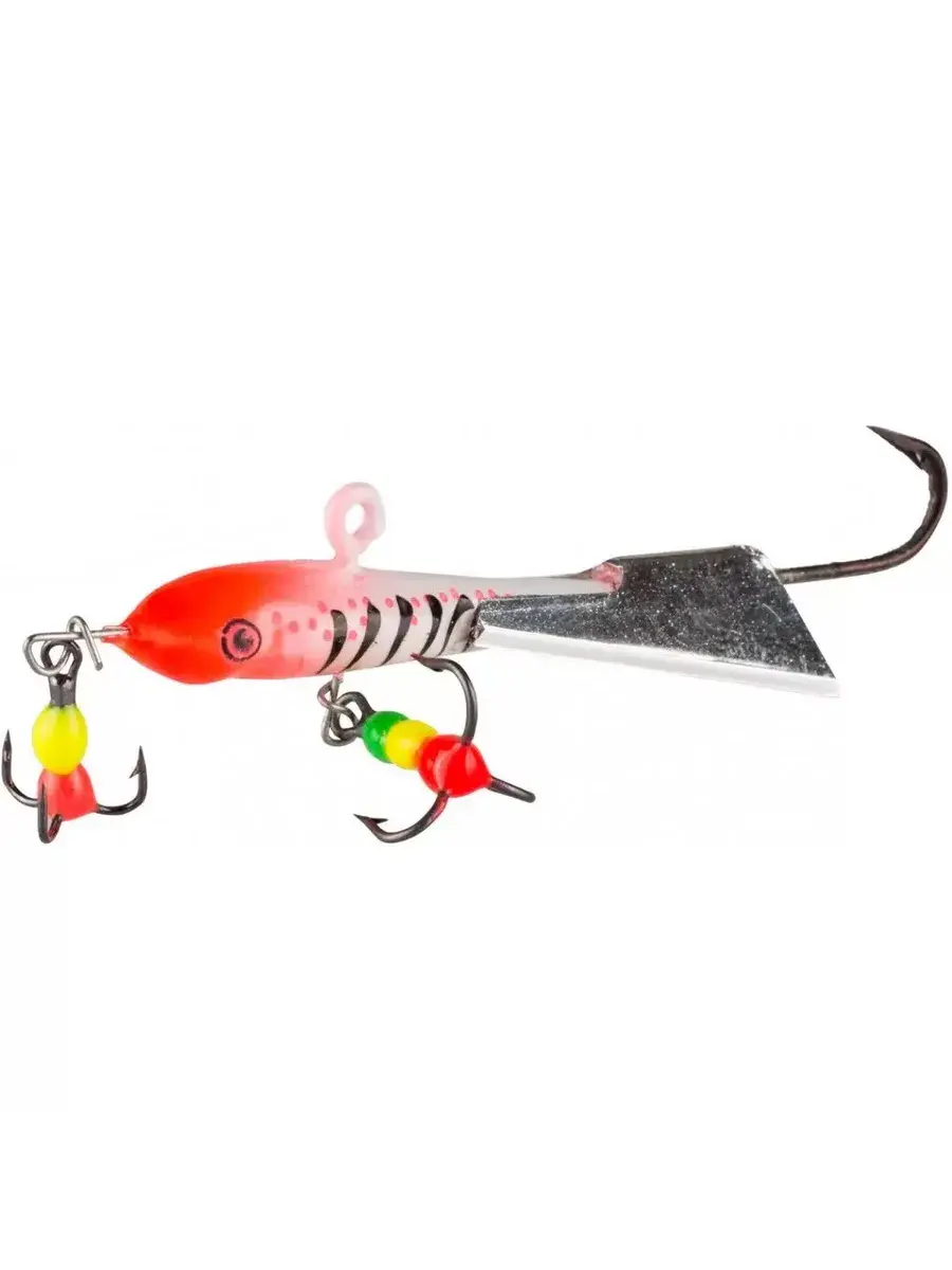 Балансир RAP №17 - приманка для рыбной ловли в зимнее время. Выглядит как небольшая рыбка с черными полосками по бокам. На приманку охотно клюют окунь, щука, судак и другие хищные рыбы. В хвосте балансира впаян одинарный крючок. Снизу на кольце крепится крючок-тройник, на который обычно и зацепляется клюнувшая рыба. На хвосте имеется стабилизатор из пластика. При движениях вверх-вниз приманка уходит то в одну, то в другую сторону, тем самым привлекая внимание хищной рыбы. Балансир покрыт специальной стойкой краской.