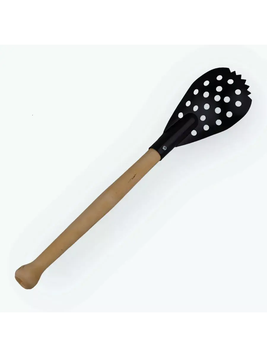 Ложка черпака изготовлена из стали с полимерно-порошковым покрытием, имеет ряд зубьев, позволяющих легко очищать лунки с большим слоем наледи. Ручка черпака изготовлена из березы, покрыта специальным защитно-декоративным составом и имеет удобную форму, предотвращающую выскальзывание черпака из рук. Ручка крепится к ложке при помощи шурупа. Прочность и надежность конструкции обеспечивает длительный срок службы черпака.