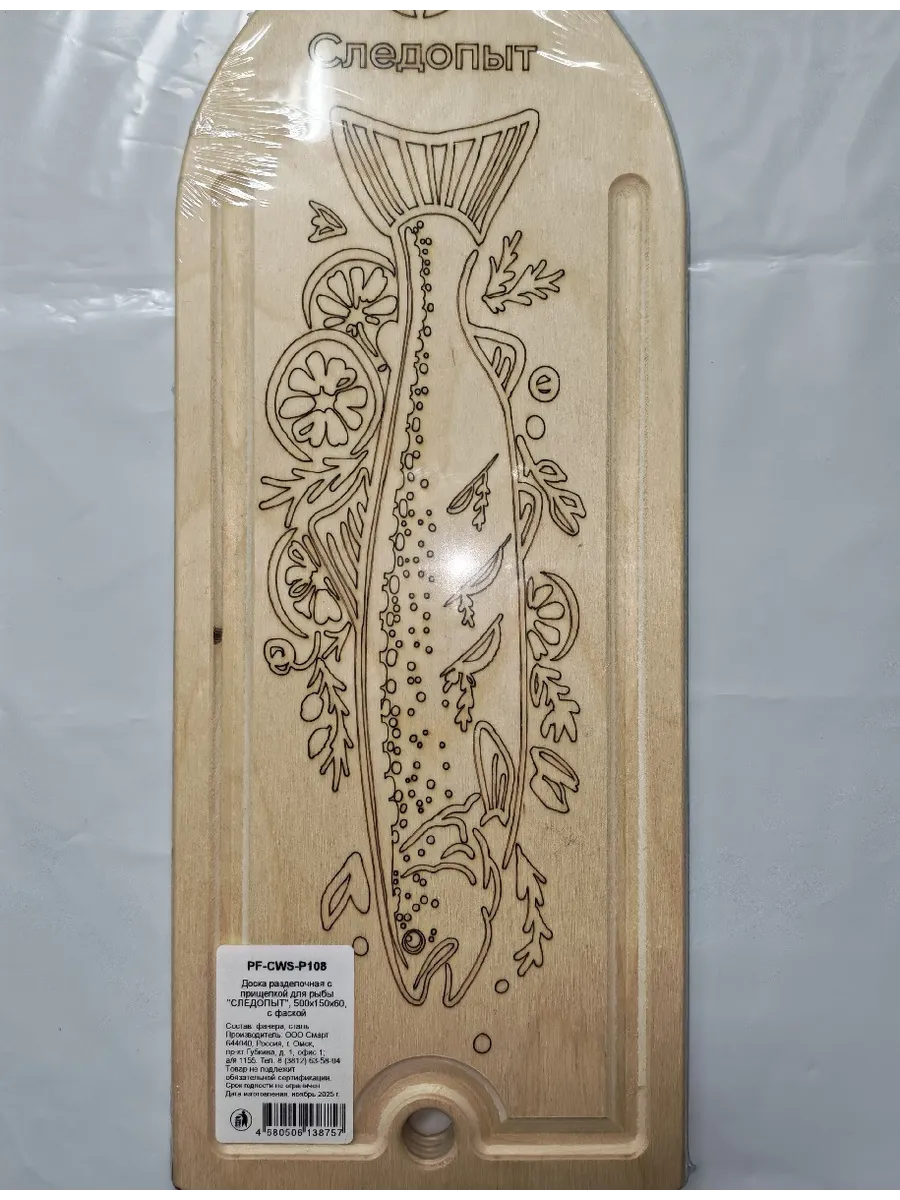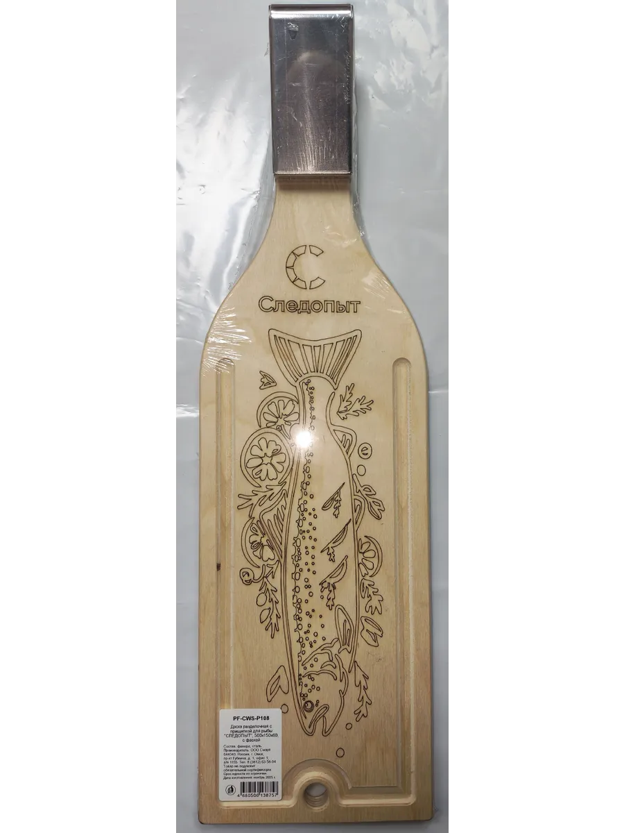 Удобная разделочная доска для рыбы. С одной стороны на которой размещен тугой зажим с острыми зубцами для фиксации хвоста рыбы, по краям доски - желобки, в которые стекает жидкость.