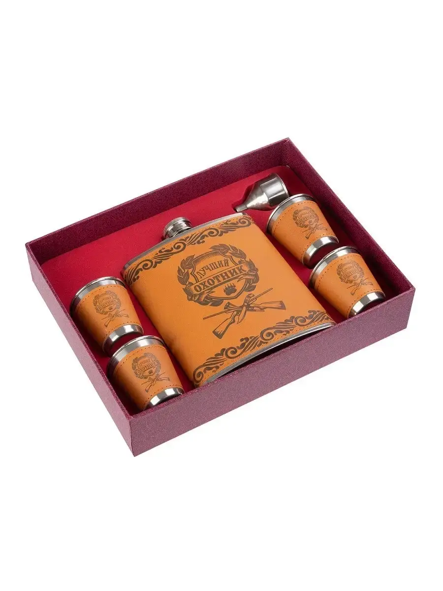 "Подарочный набор ""Лучший охотник"" в коробке:1 фляжка 540 мл;4 стопки;1 воронка. Фляжка, стопки и воронка изготовлены из нержавеющей стали. На стопки и фляжку сверху нанесена искусственная кожа с рисунком.".