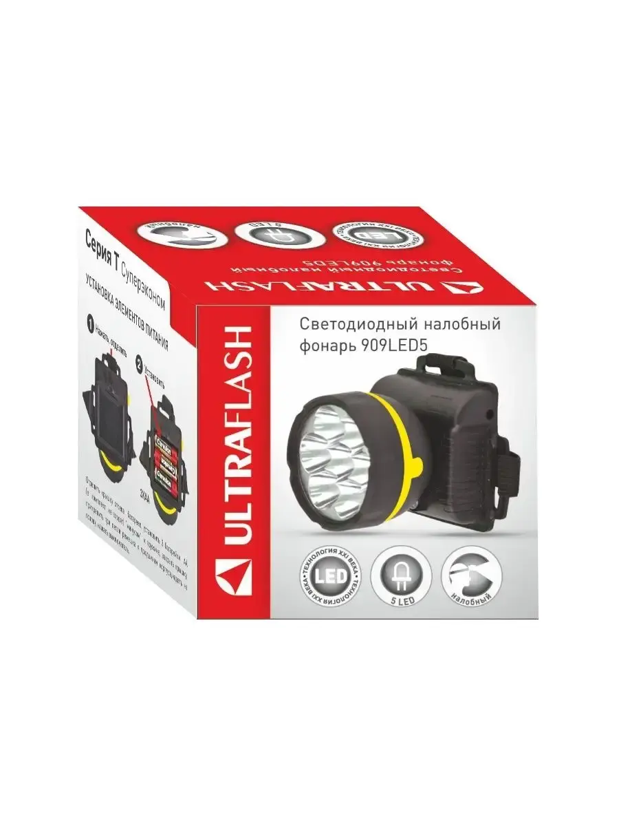 Фонарь налобный Ultra Flash 909LED5 - это компактное и удобное для использования осветительное устройство, которое крепится на голову пользователя и позволяет освободить обе руки для выполнения необходимых работ. Фонарь работает от обычных батареек. Источником света является 5 светодиодов. Изделие работает в одном режиме.Характеристки:- Цвет: Черный- Максимальный линейный размер фонаря, мм: 75- Размеры фонаря, мм: 75 x 85 x 75- Применяемые элементы питания: 3XR6 (в комплект не входят)- Источники света: 5 LED- Потребляемая мощность(Вт): 0,5- Соответствие лампе накаливания(Вт): 1,5- Цветовая температура, K: 8000- Световой поток(Лм): 18- Материал корпуса: пластик- Дистанция освещения: до 20 м- Время работы на солевых батарейках: до 40 часов- Степень защиты: IP44- Индивидуальная упаковка: цветная коробка