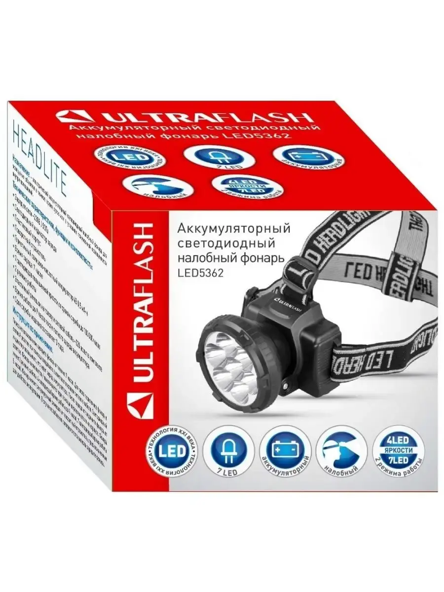 Фонарь Ultraflash электрический светодиодный налобный аккумуляторный. Цвет корпуса: матовый черный. Материал корпуса - пластик. Источники света - 5 светодиодов с индивидуальными отражателями и суммарным световым потоком - до 20 люмен. Дистанция освещения - до 20 метров. 2 режима работы - 5 светодиодов в режиме полной мощности / 5 светодиодов в режиме половины мощности. Выключатель: двухпозиционный кнопочный. Время работы до 5 часов. Время заряда 7 часов. Комплектация: фонарь, герметичный свинцово-кислотный аккумулятор DC 4 вольт 0,42 А-ч, сетевой кабель для заряда от сети ~220 В, поворотный отражатель, эластичный головной ремешок, инструкция, упаковка. Степень пыле-влаго-защиты IP22. Упаковка - коробка. Максимальный линейный размер фонаря 6 см. Размер упаковки 9 x 7 x 6,5 см.
