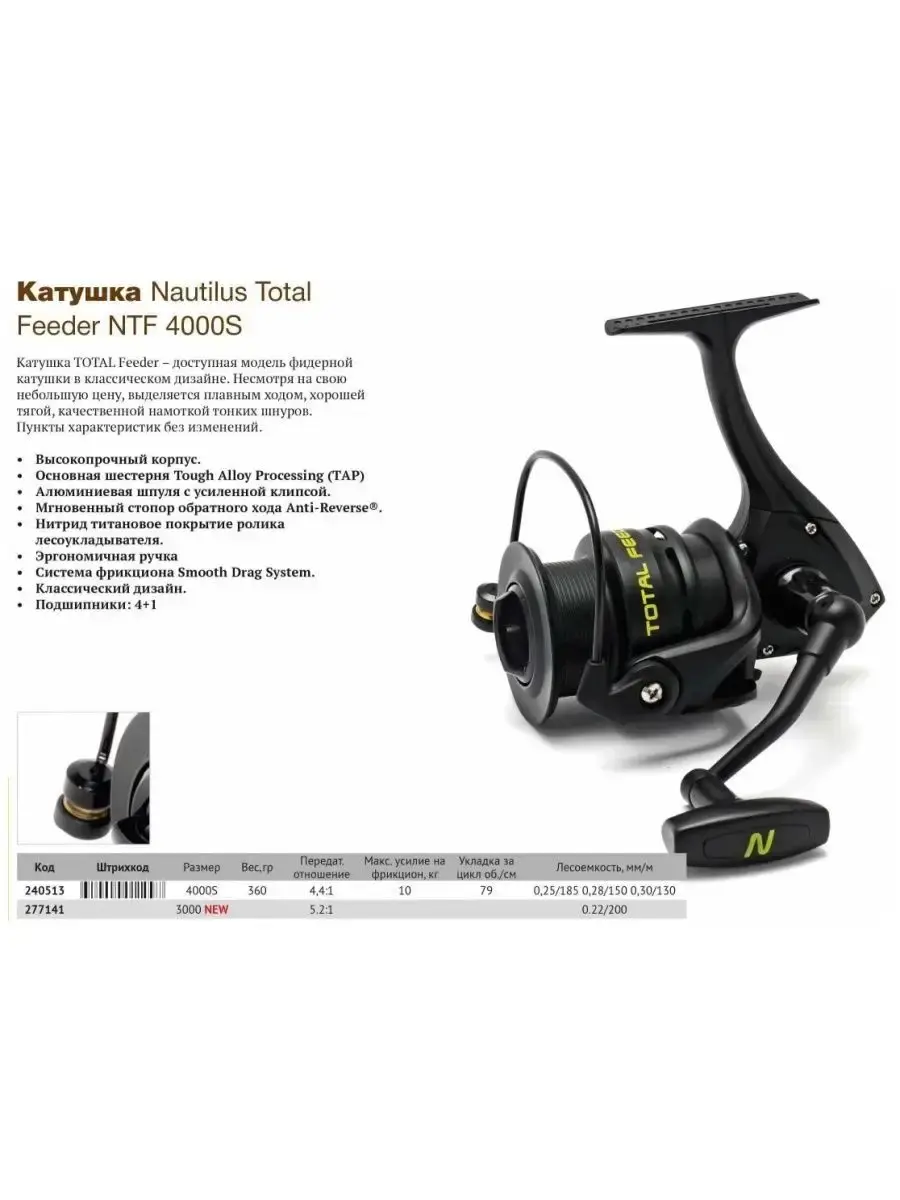 Nautilus Total Feeder - бюджетная безынерционка для ловли на фидер. Выполнена в классическом дизайне, имеет прочный корпус и эргономичную рукоять. Механизм катушки отличается плавным ходом, за что отвечают 5 подшипников. Также он обладает хорошей тяговитостью. Система фрикциона Smooth Drag System позволяет с точностью настроить тормозное усилие. В механизме установлена надежная основная шестерня Tough Alloy Processing (ТAP). Также имеется мгновенный стопор обратного хода. На алюминиевой шпуле расположена усиленная клипса для фиксации лески. Ролик лесоукладывателя имеет напыление из нитрида титана. Передаточное число: 4,4:1.Характеристики:Производитель: NautilusВес, гр.: 367Диаметр переднего бортика шпули, мм.: 52Кнопка на рукояти: нетКоличество подшипников: 4+1Комплектация: Запасной шпули в комплекте нетНагрузка на фрикцион, кг.: 10Намотка за оборот ручки, см.: 79Объем шпули, мм/м.: 0,25/185Передаточное число: 4,4:1Способ крепления рукояти: прижимной винтТип механизма: планетарныйФрикцион: передний