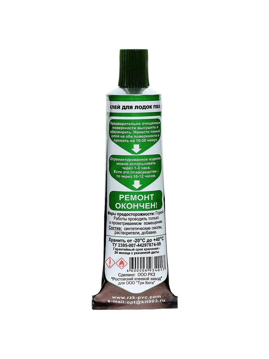 Клей «Три кита» предназначен для ремонта лодок, сапог, вейдерсов и других изделий из ткани ПВХ. Отличается морозоустойчивостью и эластичностью, легко наносится и быстро высыхает. В состав входят растворители, синтетические смолы и специальные добавки