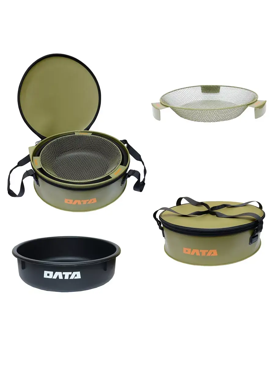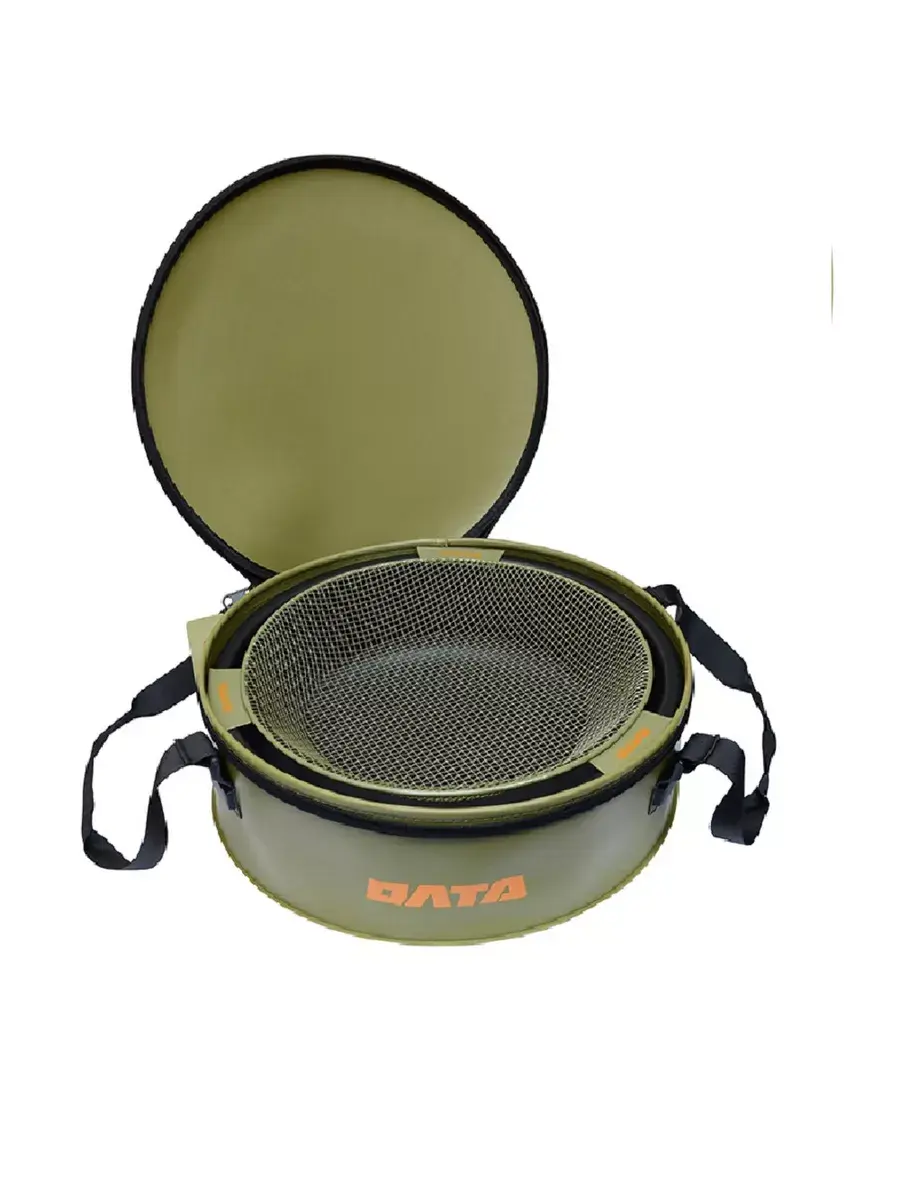 В комплект входит ведро объемом 10л из EVA с крышкой, тазик для замешивания прикормки и металлическое сито.
