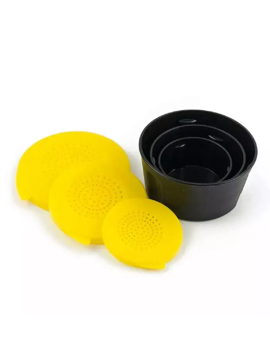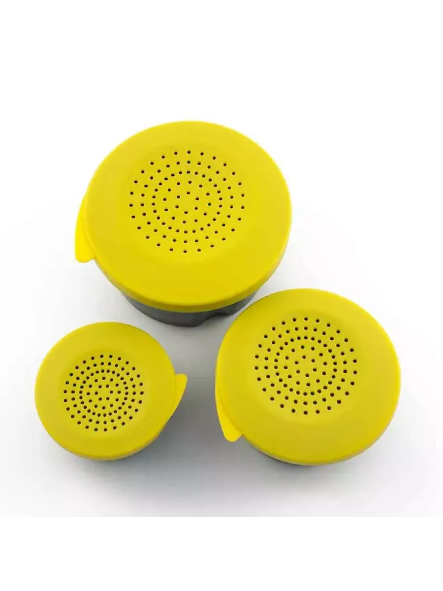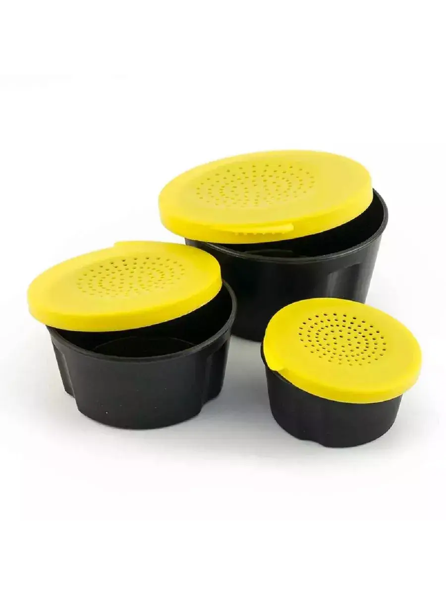 Набор баночек для червей. Очень удобный комплект, состоящий из 3 банок разного объема и размера. Все баночки помещаются друг в друга, как матрешка. Удобство такого набора заключается хотя бы в том, что если рыбачишь не один, не надо бегать постоянно к общей банке с наживкой. Отсыпал себе и лови в стороне. Плотные крышки, случайно не откроются. В крышках баночек есть перфорация для вентиляции.