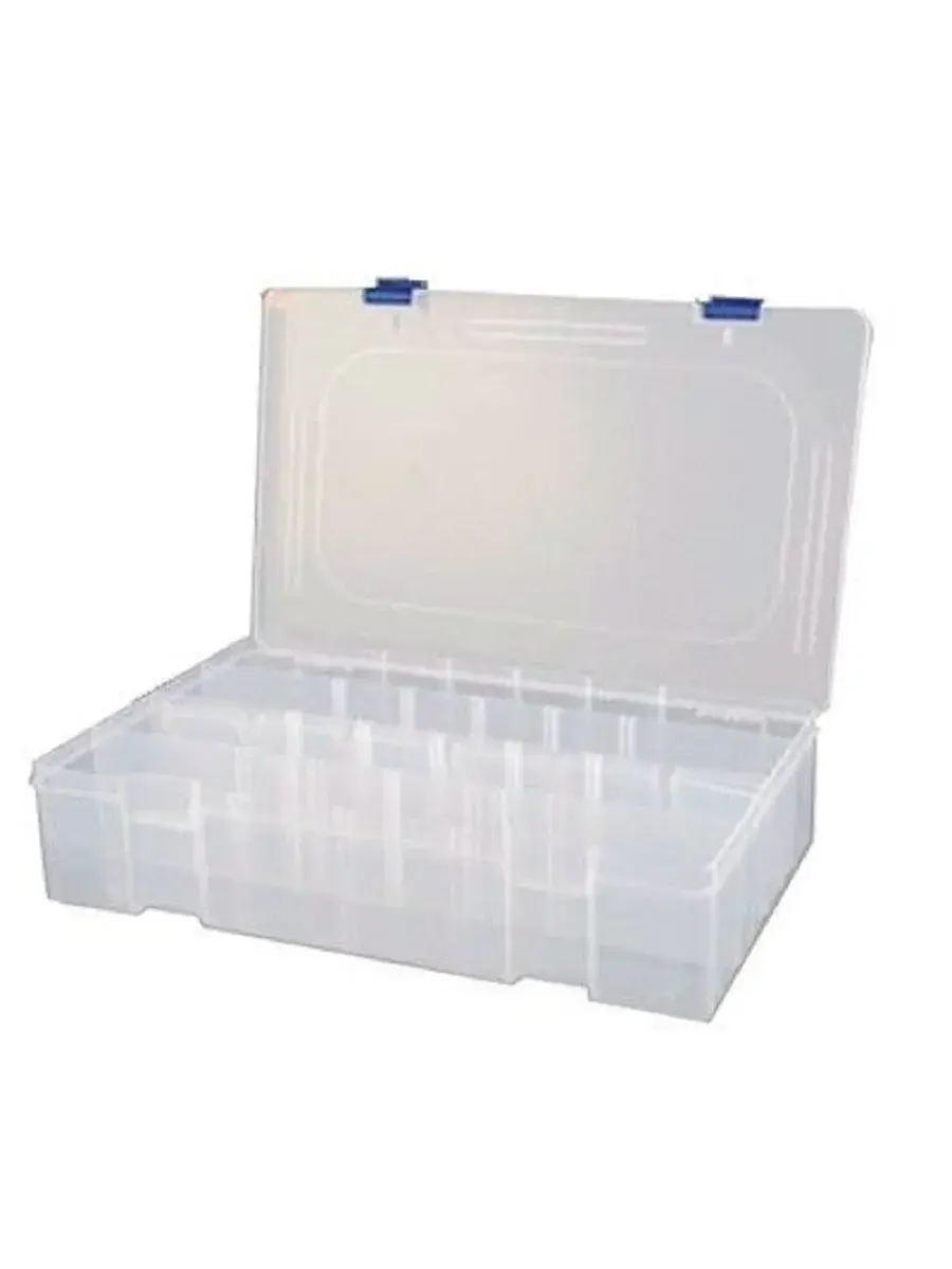 Прозрачный корпус поможет быстро определить содержимое коробки. Для фиксации крышки используются надёжные и долговечные защёлки.