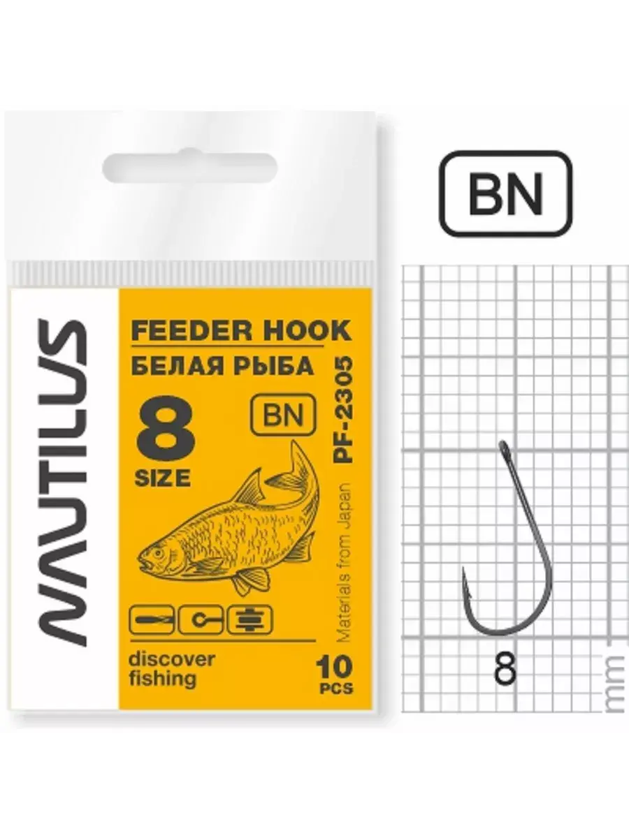Название Feeder PF-2305BN носит линейка одинарников, что создана специалистами Nautilus. Ориентирована на донную ловлю белой рыбы может применяться и в поплавочных оснастках. Для производства используется японская стальная проволока. Поддев кованый. Это обеспечивает хороший прочностной запас и стойкость к деформации под воздействием нагрузок. Острозаточенное жало проникает легко в рыбью пасть, что делает подсечку проще. После поклевки удержанию добычи способствует бородка. Для крепления к остальной оснастке есть округлое ушко. Линейка расфасована в блистеры по 10 крючков в каждом.