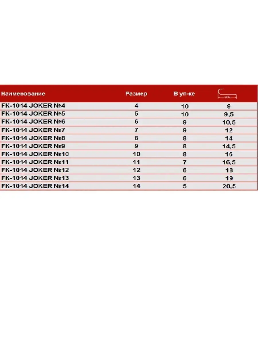FANATIK FK-1014 JOKER – Специальная модель, разработанная для поплавочной ловли на некрупную живую наживку: опарыша, мотыля, «бутерброды»с мотылем, где он подсажен к зерну перловки или опарышу. Пусть изящество крючка не обманывает вас: благодаря особой силовой форме эта модель, хотя и выполненная из довольно тонкой проволоки, превосходно сопротивляется повышенным нагрузкам. Да и при подсечке крючок работает идеально, ведь его жало, благодаря плавному изгибу цевья, направлено в сторону колечка, и входит в рыбью губу без малейшего усилия.