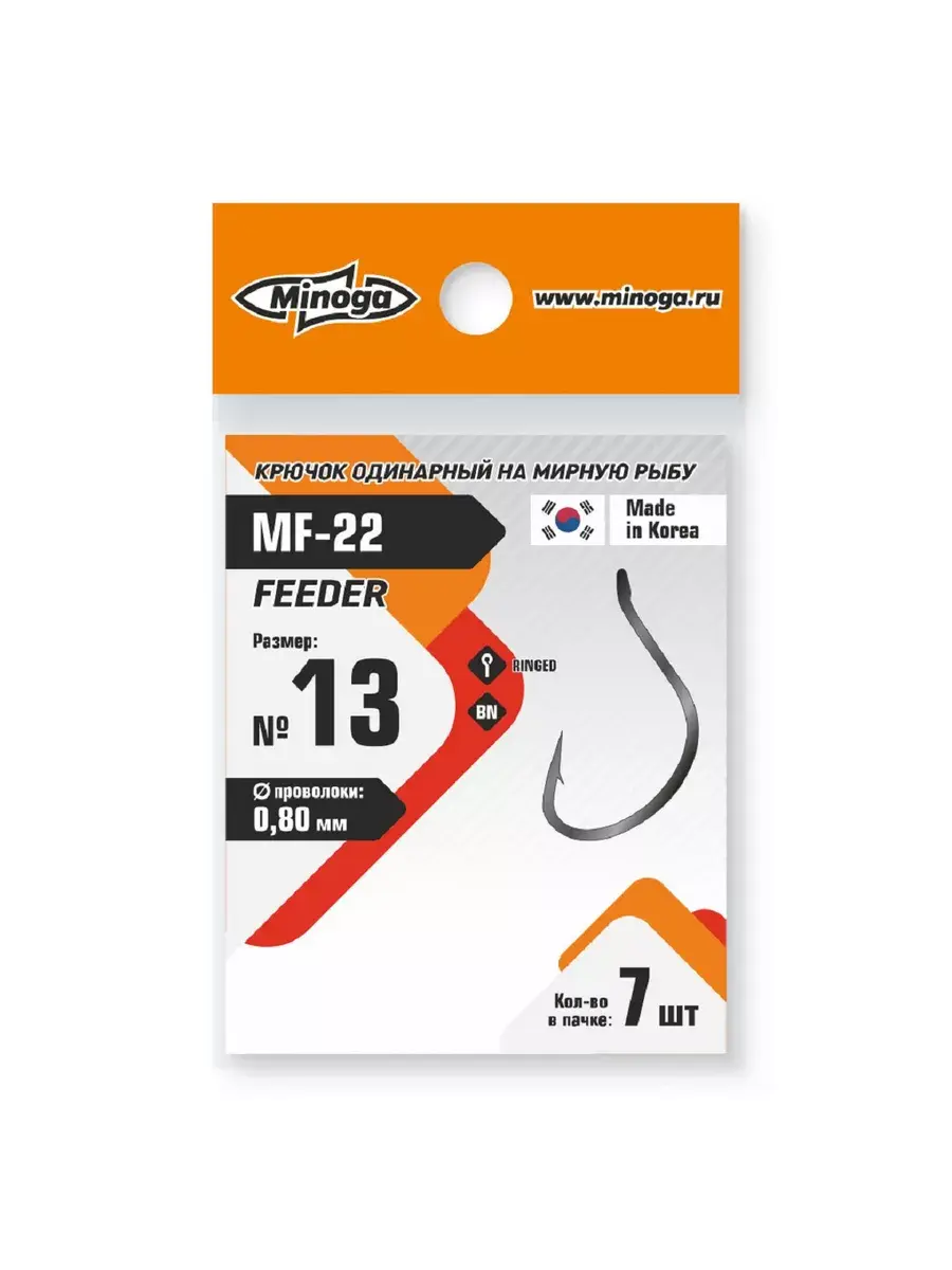 Крючок FEEDER MF-22 изготовлен из средней толщины проволоки высокоуглеродистой стали VHI-Carbon, что обеспечивает ему безупречное качество. Благодаря особенной форме он является отличным само подсекающимся крючком и широко используется на многих способах и видах ловли, где затруднена мгновенная подсечка рыбы из-за внешних факторов(ветра, волн). Позволяет использовать не только растительные, но и животные насадки. Темное антикоррозийное покрытие обеспечивает крючку защиту от ржавчины даже в соленой воде, а также великолепно маскирует его, исключая возникновение бликов. Минога - с любовью к рыбалке!