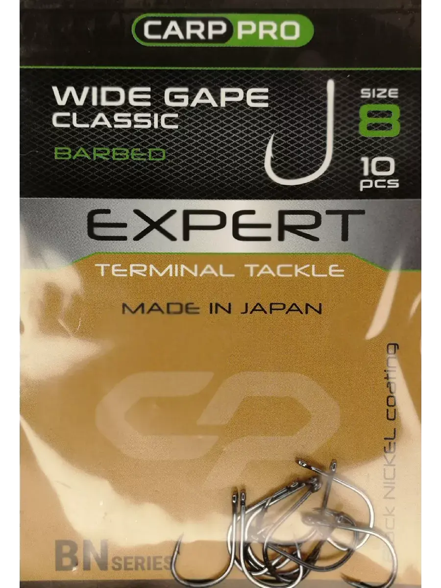 Carp Pro Black Nickel Wide Gape Classics — серия карповых крючков классической формы, с широким зевом для всех видов и типов насадок. Используется как с термоусадками и лентяйками, так и без них. Материал крючка — особо прочная, высокоуглеродистая сталь. Благодаря японской технологии химической обработки жала, крючок всегда очень острый. Кончик жала слегка изогнут, что обеспечивает отличную засечку. Крючок имеет высококачественное, антикоррозийное покрытие из никеля (что указано в спецификации BN). Темное, никелевое покрытие не только делает крючок малозаметным в толще воды, но и надежно сохраняет его от ржавчины. В зависимости от габаритов рыбы, на которую планируется вестись охота, можно подобрать крючок нужного размера. Доступен в размерах № 8, 6, 4, 2. В упаковке — 10 шт.