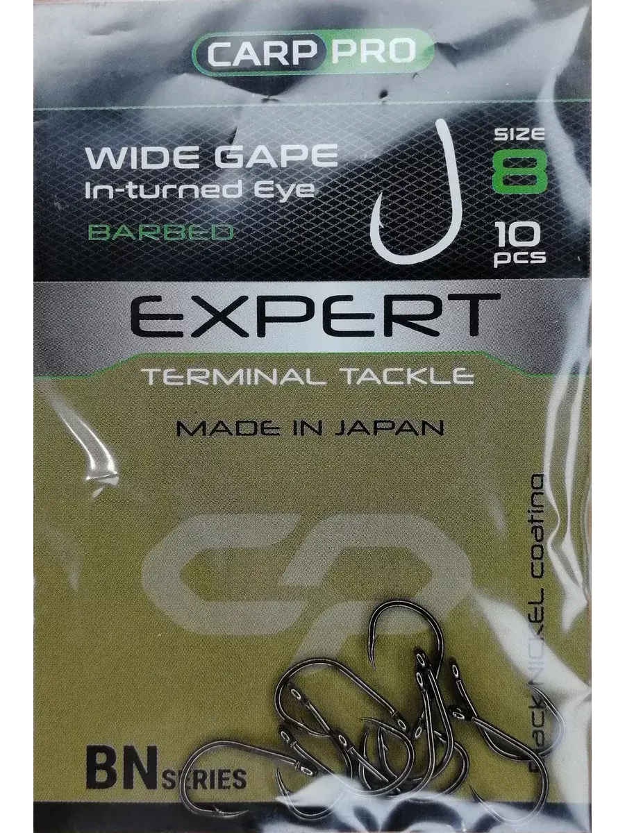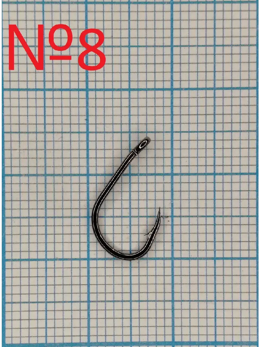 Wide Gape in-turned Eye — серия крючков с широким зевом и правильно подогнутым внутрь ушком. Такая универсальная форма придает этой серии мегазасекаемость и отличную фиксацию рыбы. Материал крючка — особо прочная, высокоуглеродистая сталь. Благодаря японской технологии химической обработки жала, крючок всегда очень острый. Вдобавок кончик жала слегка изогнут внутрь, что гарантирует 100-процентную засечку. Поэтому серия Wide Gape in-turned Eye пользуется чрезвычайной популярностью у большого количества рыбаков, ловящих карпа. Крючок имеет высококачественное, антикоррозийное покрытие из никеля (что указано в спецификации BN). Темное, никелевое покрытие не только делает крючок малозаметным в толще воды, но и надежно сохраняет его от ржавчины. В зависимости от габаритов рыбы, на которую планируется вестись охота, можно подобрать крючок нужного размера. Доступен в размерах № 8, 6, 4, 2.