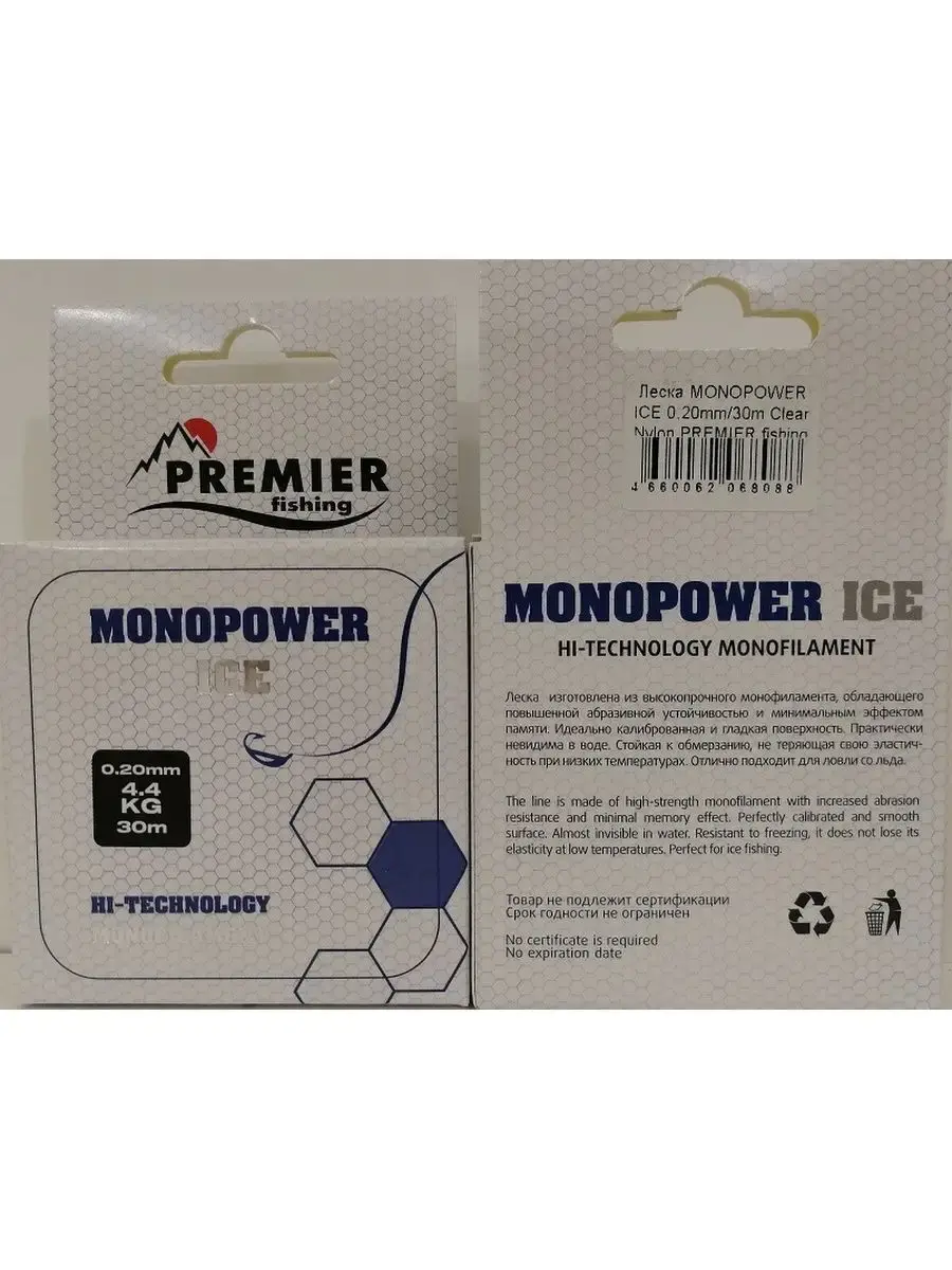 Леска MONOPOWER ICE торговой марки Premier fishing выполнена из высокопрочного монофиламента, обладающего повышенной абразивной устойчивостью и минимальным эффектом памяти. Идеально калиброванная и гладкая поверхность. Практически невидима в воде.Леска стойкая к обмерзанию, не теряет свою эластичность при низких температурах. Отлично подходит для ловли со льда. Позволяет работать очень легкими приманками и чувствовать при этом каждое прикосновение рыбы.