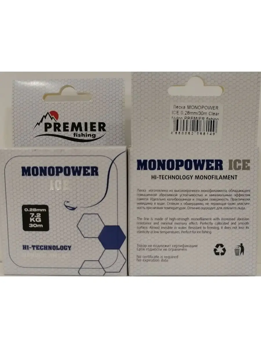 Леска MONOPOWER ICE торговой марки Premier fishing выполнена из высокопрочного монофиламента, обладающего повышенной абразивной устойчивостью и минимальным эффектом памяти. Идеально калиброванная и гладкая поверхность. Практически невидима в воде.Леска стойкая к обмерзанию, не теряет свою эластичность при низких температурах. Отлично подходит для ловли со льда. Позволяет работать очень легкими приманками и чувствовать при этом каждое прикосновение рыбы.