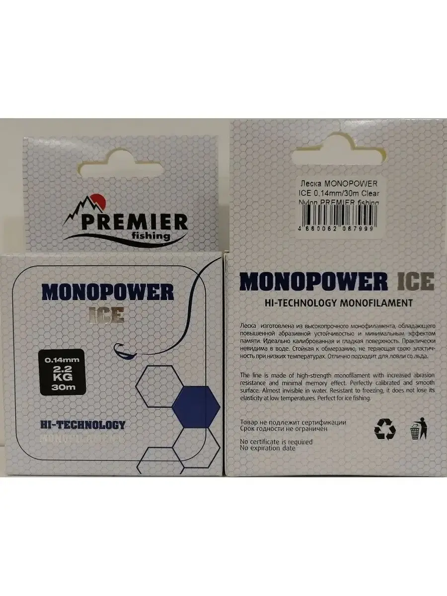 Леска MONOPOWER ICE торговой марки Premier fishing выполнена из высокопрочного монофиламента, обладающего повышенной абразивной устойчивостью и минимальным эффектом памяти. Идеально калиброванная и гладкая поверхность. Практически невидима в воде.Леска стойкая к обмерзанию, не теряет свою эластичность при низких температурах. Отлично подходит для ловли со льда. Позволяет работать очень легкими приманками и чувствовать при этом каждое прикосновение рыбы.
