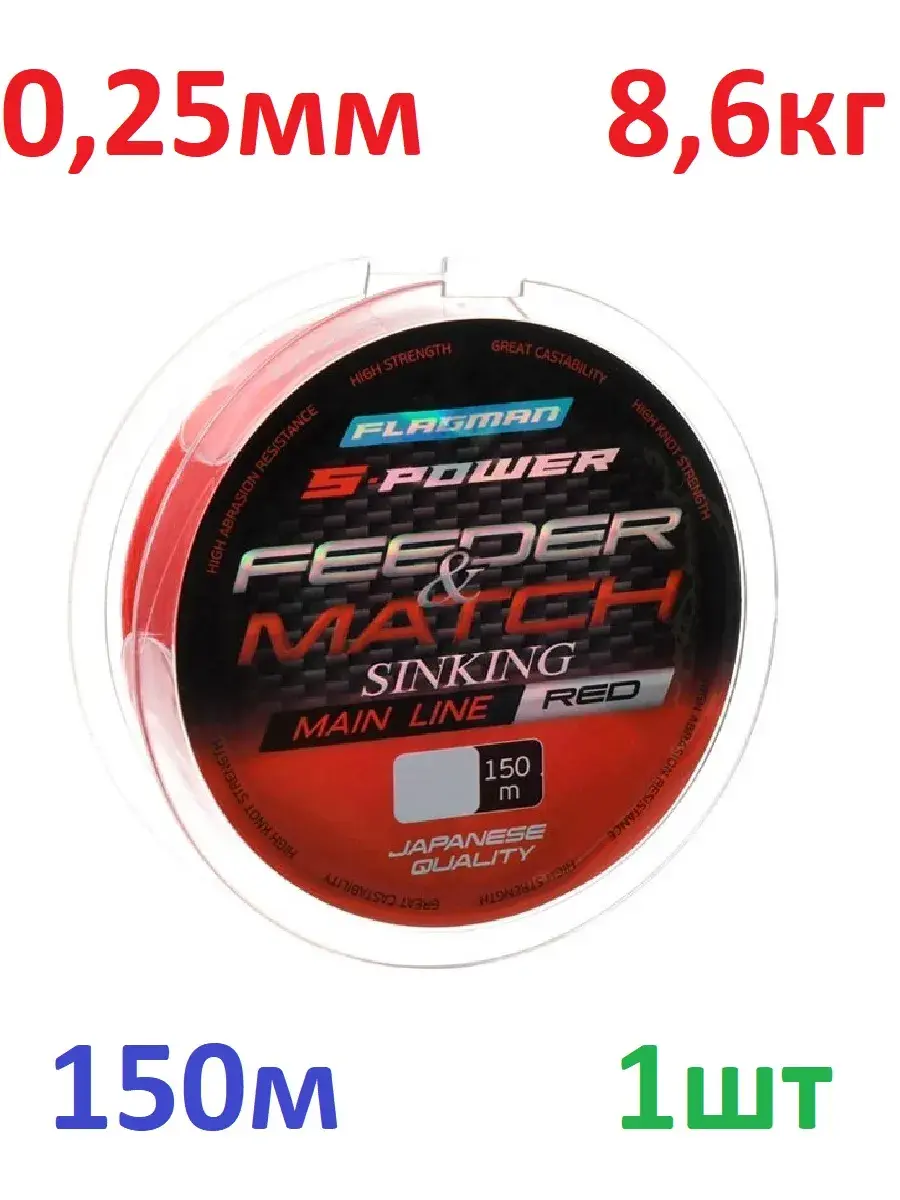 Flagman S-Power Feeder/Match Sinking Main Line – тонущая леска нового поколения, изготовленная по передовым японским технологиям из современных полимеров. Предназначена для использования в качестве основной лески на фидерной снасти, а также на поплавочной снасти для дальнего заброса. Имеет исключительно гладкую поверхность и среднюю жесткость, что позволяет выполнять дальние и точные забросы. К достоинствам S-Power Feeder/Match Sinking Main Line также можно отнести минимальную растяжимость, повышенную устойчивость к абразиву, высокую прочность, в том числе и на узлах, минимальный коэффициент памяти. Серия Flagman S-Power Feeder/Match Sinking Main Line представлена в красном цвете.