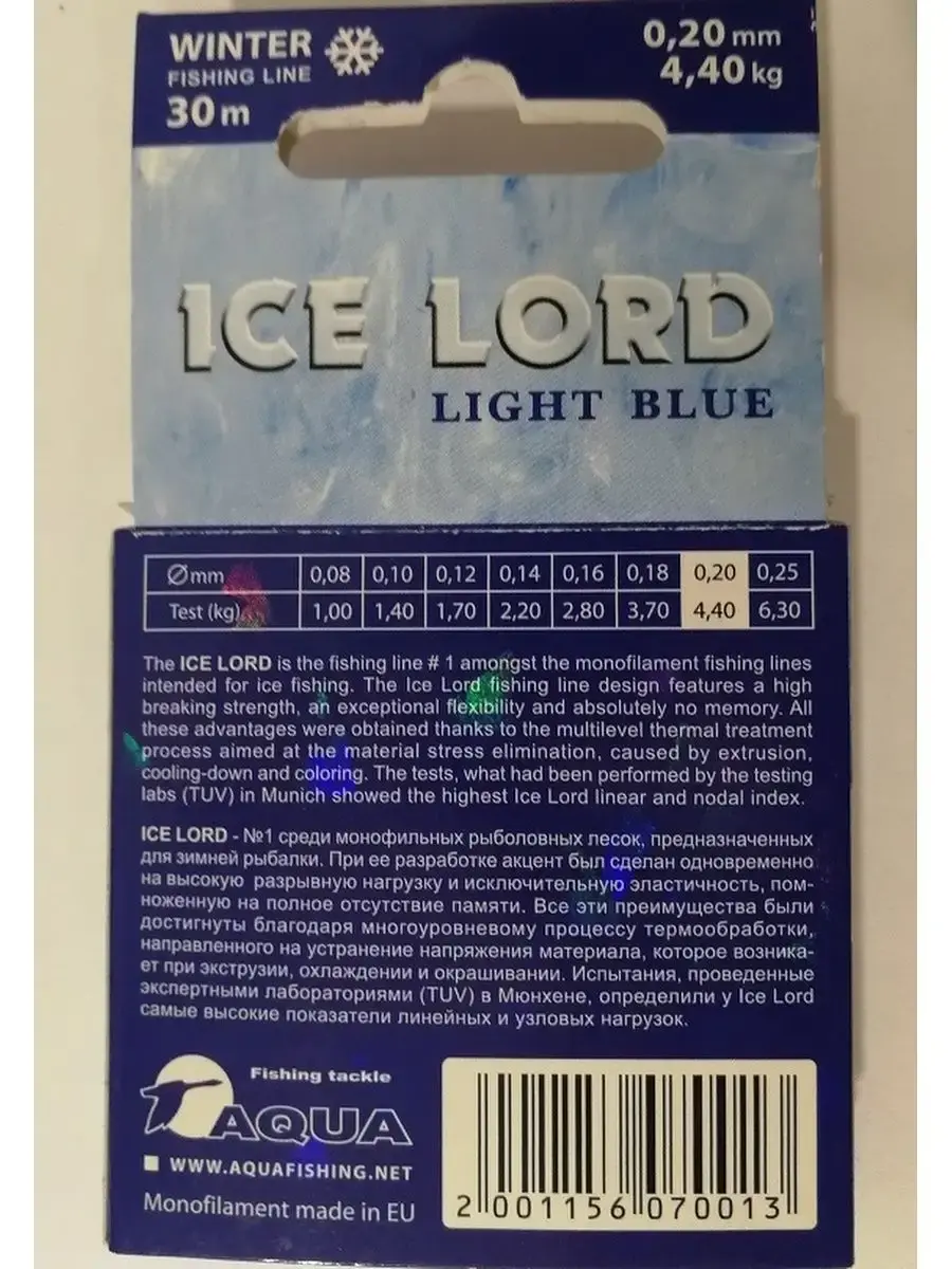 Ice Lord - №1 среди монофильных рыболовных лесок, предназначенных для зимней рыбалки. При ее разработке акцент был сделан одновременно на высокую разрывную нагрузку и исключительную эластичность, помноженную на полное отсутствие памяти. Все эти преимущества были достигнуты благодаря многоуровневому процессу термообработки, направленного на устранение напряжения материала, которое возникает при экструзии, охлаждении и окрашивании. Испытания, проведенные экспертными лабораториями (TUV) в Мюнхене, определили у Ice Lord самые высокие показатели линейных и узловых нагрузок.