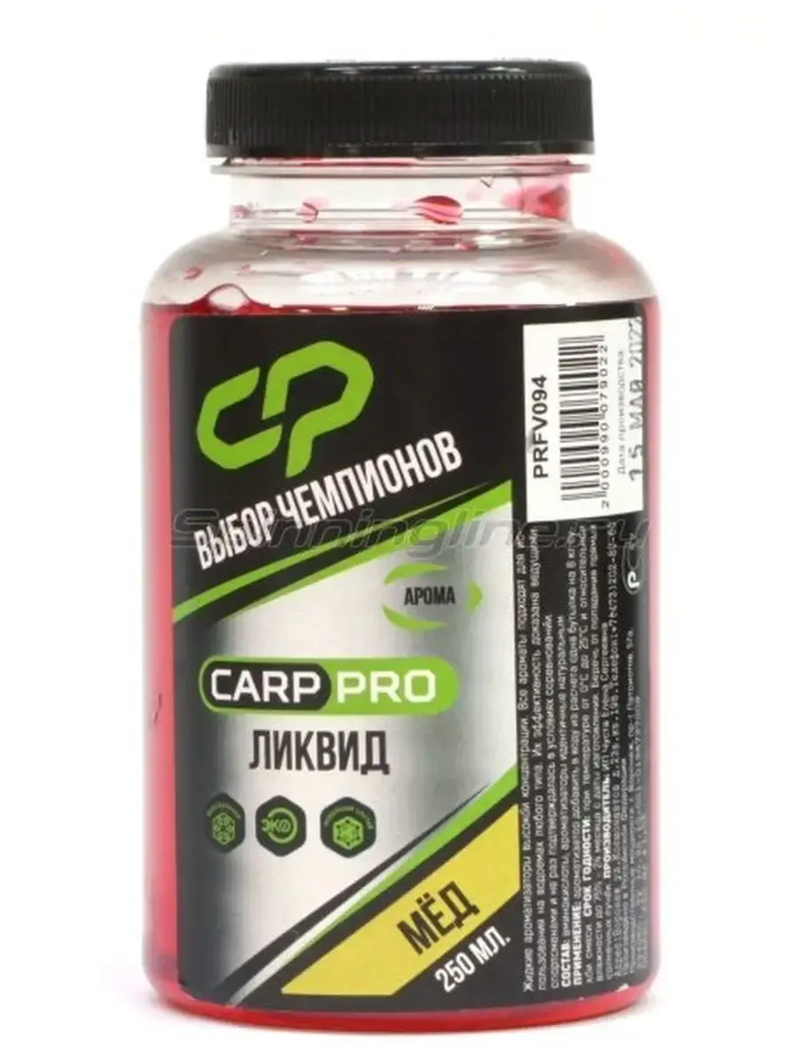 Carp Pro Мёд – жидкая добавка в прикормочную смесь с ароматом мёда. Аромат мёда – неотъемлемая часть любой карповой рыбалки. Эта ароматика является универсальной и привлекательной для любой рыбы. Использовать можно как добавку или замешивать в прикормку, предварительно разведя ликвид в воде.