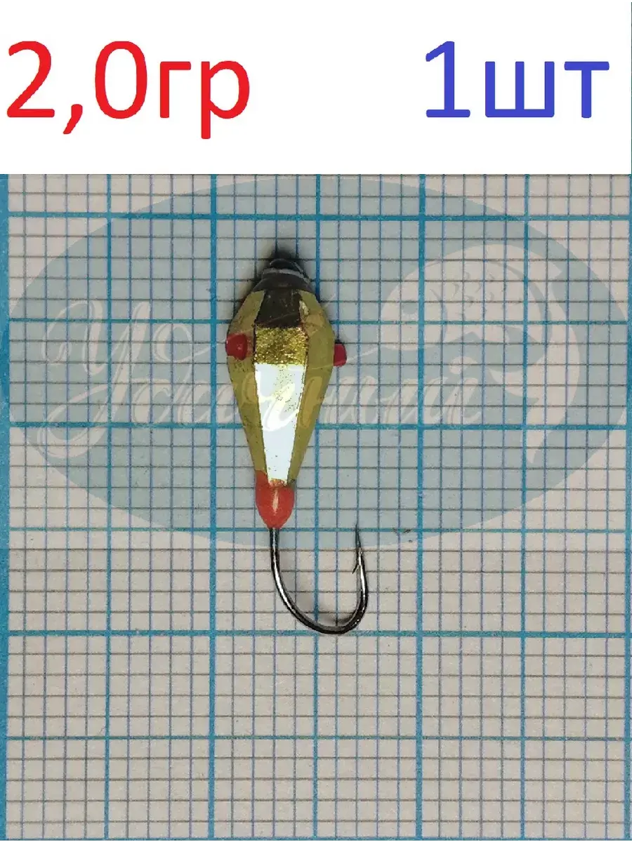 Мормышка выполнена в форме капли с гранями, на стороне и обеих концах которой расположены бусины, также мормышка оснащена крюком.