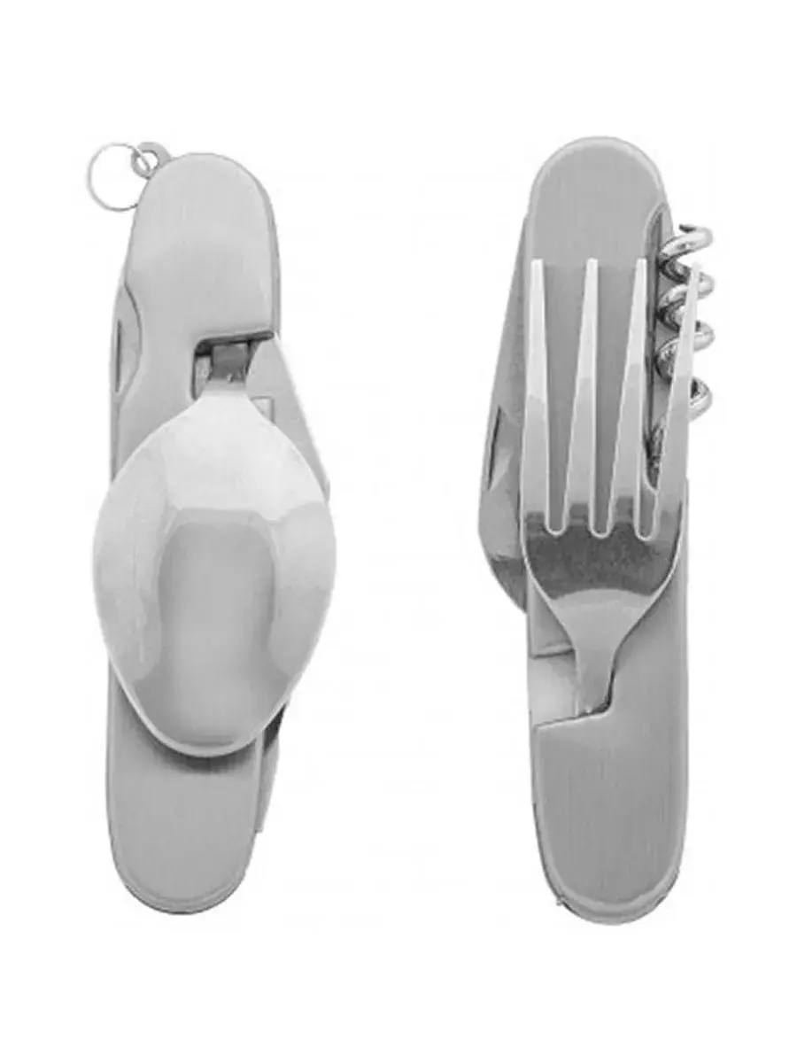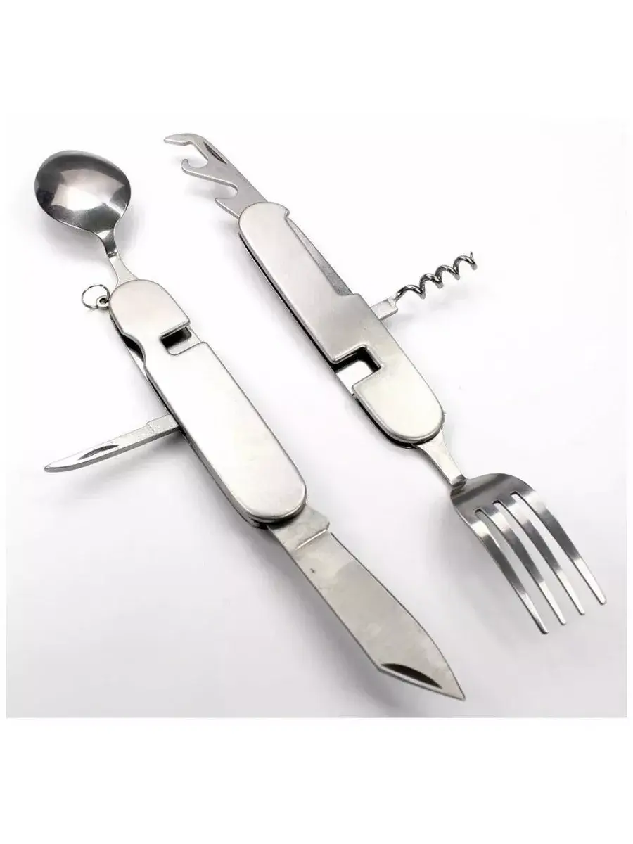 Многофункциональный походный мультитул незаменим на пикнике и рыбалке, во время путешествий или просто отдыха на природе. Все предметы легко выдвигаются и ими удобно пользоваться. Также можно разложить мультитул на две части, в результате чего получатся два отдельных столовых прибора.