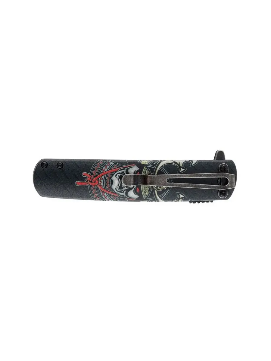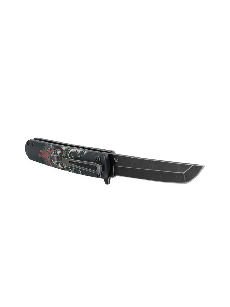 Нож Ganzo 626 приятно удивит не только любителей простых и практичных EDC-ников, но также и тех, кто любят некую «изюминку» в модели. Здесь таковой является дизайнерское оформление флиппера, для которого придумали 4 различных варианта рукояти. Можно подобрать обычный чёрный цвет, а можно взять что-то из предложенных экземпляров с рисунками. Это стильно выглядит, и поможет владельцу такой модели выделиться на фоне других ножеманов. У ножа клинок формы Tanto. Подобная форма считается эффективной для колющих движений при работе с твёрдыми или плотными видами материалов. Изделие окажет пользу в туристической деятельности и активном отдыхе. Рукоять прямоугольной формы, а клинок фиксируется при помощи замка вида Flipper. Ножевой механизм даёт возможность открывать и закрывать клинок буквально одной рукой. Замок действенный и надёжный, гарантирует безопасность работы с ножом Ganzo 626. Клинок выполнен из стали марки 440A. Сталь отличается большой прочностью, и богата на содержание таких элементов, как углерод и хром. Твёрдость материала составляет порядка 54-57 единицы Роквелла. Эта сталь весьма твёрдая, но всё равно важно избегать чрезмерных механических нагрузок, в противном случае клинок поломается. Ручка экземпляра сделана из материала ABS. ABS-пластик являет собой стойкую к ударам техническую термопластическую смолу. Подобный материал имеет стойкость к действию морозов, также он без последствий переносит высокие температуры. Что идеально, когда речь заходит о применении модели в активном отдыхе и туризме. ABS-пластик адаптирован к условиям окружающей среды. Высокая химическая стойкость. Длина общая ножа достигает 21,6 сантиметра. Длина клинка – 9,6 сантиметра. Толщина клинка достигает 0,27 сантиметра. Вес равен 127 граммам. Есть клипса для комфортной фиксации.
