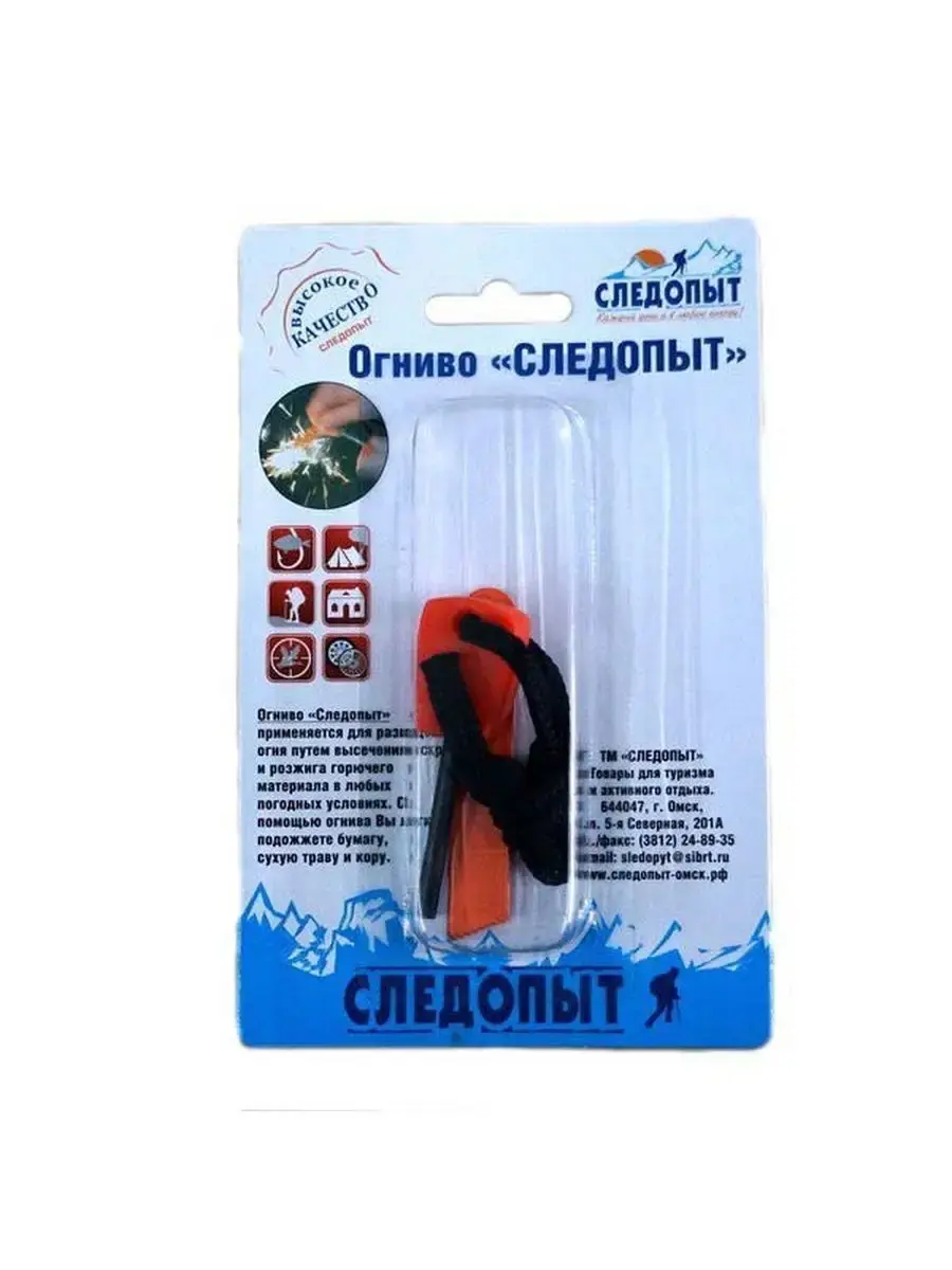 Огниво «Следопыт» применяется для разведения огня путем высечения искр и розжига горючего материала в любых погодных условиях. С помощью огнива Вы легко подожжете бумагу, сухую траву и кору. Стержень: феросплав, с содержанием магния. Ручка: пластик.Характеристики:Диаметр стержня: 4,0 ммГабариты примерные: 60 х 22 х 20 ммТемпература искры: 3000 градусовМатериал: феросплав с магниемВес: 20 грКоличество ударов: 3000 шт