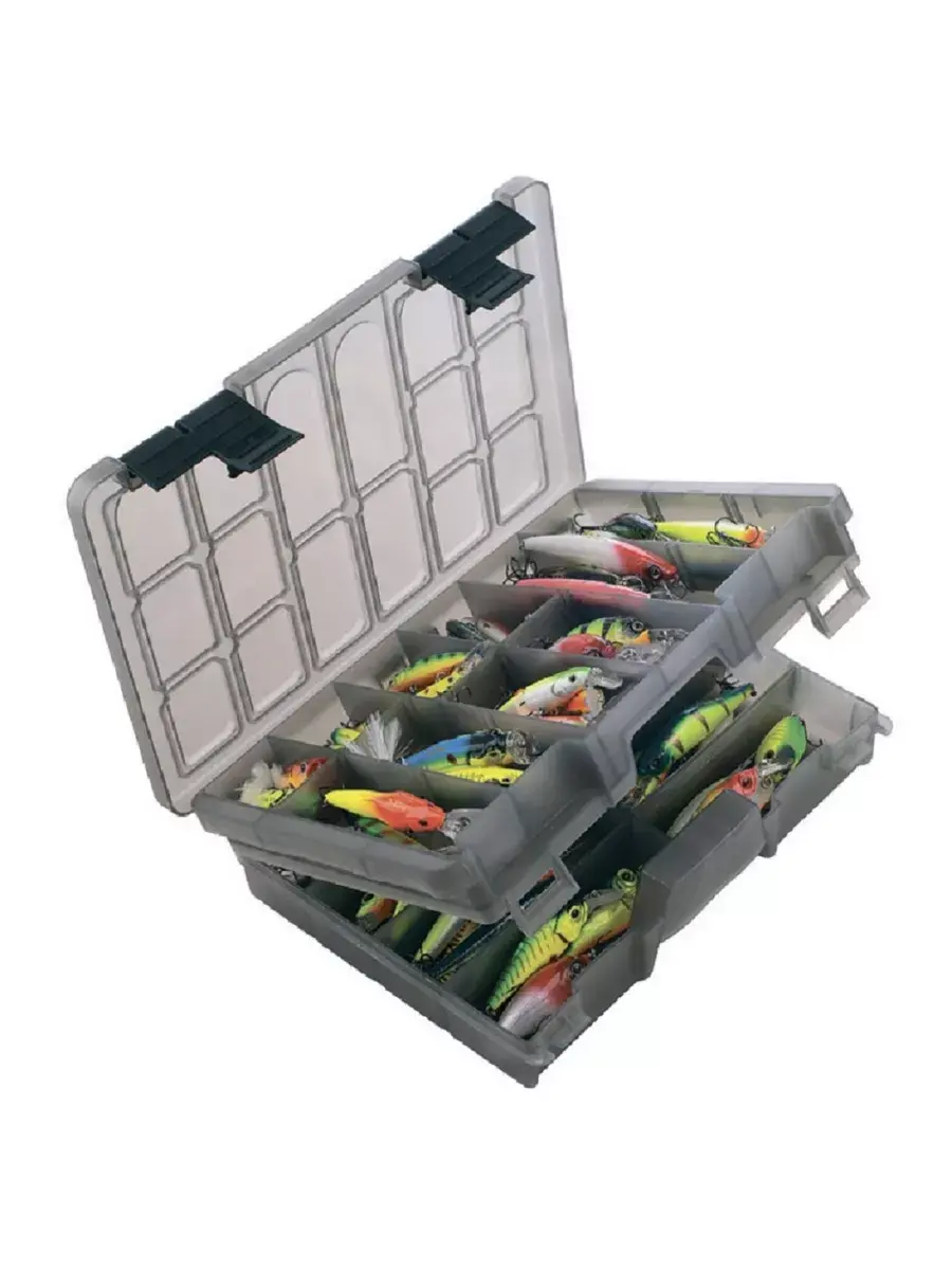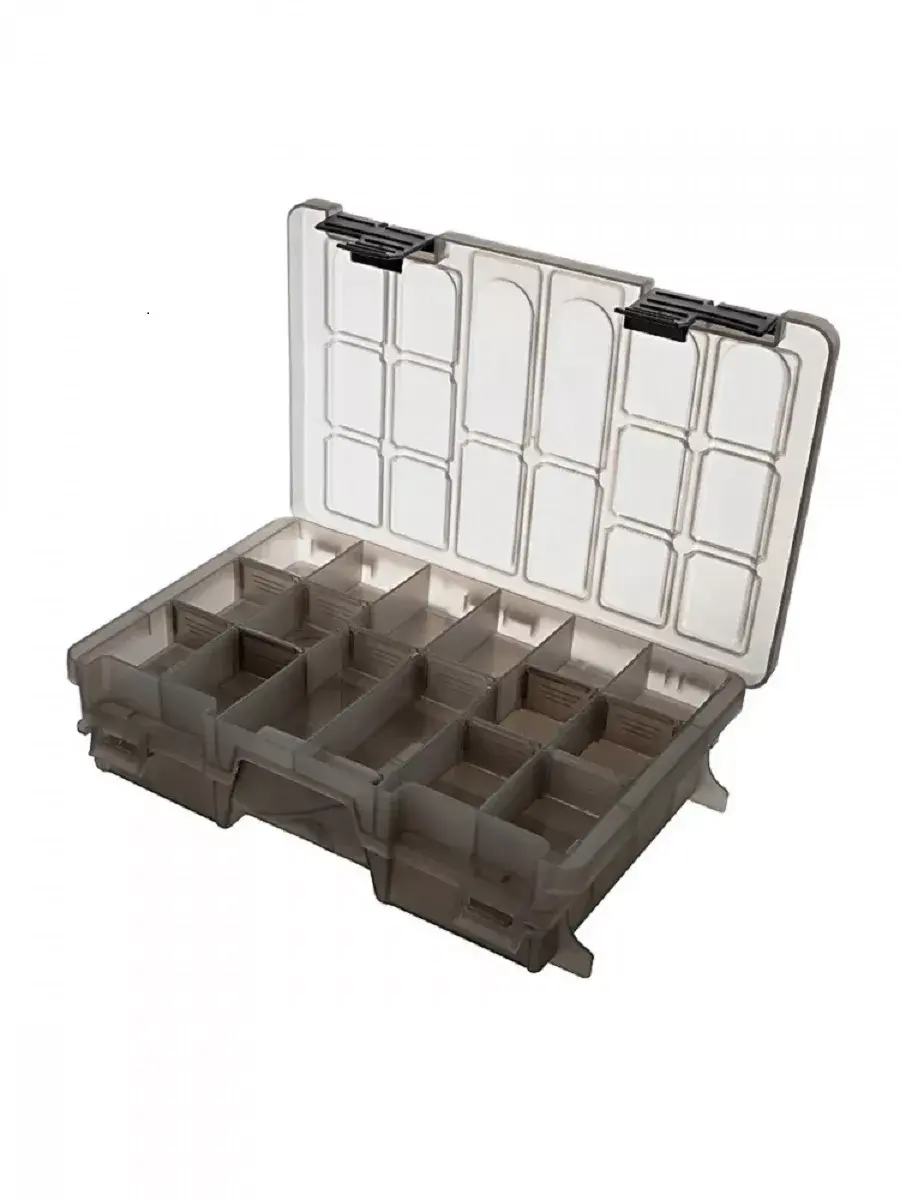 Двухъярусная коробка Три кита 0046-2 со съёмными перегородками. Имеет два изолированных отделения: верхнее - 6 ячеек и 10 съёмных перегородок, нижнее - 5 ячеек и 9 съёмных перегородок. Органайзер предназначен для хранения приманок и мелких рыболовных принадлежностей (крючки, грузила и т.д.).
