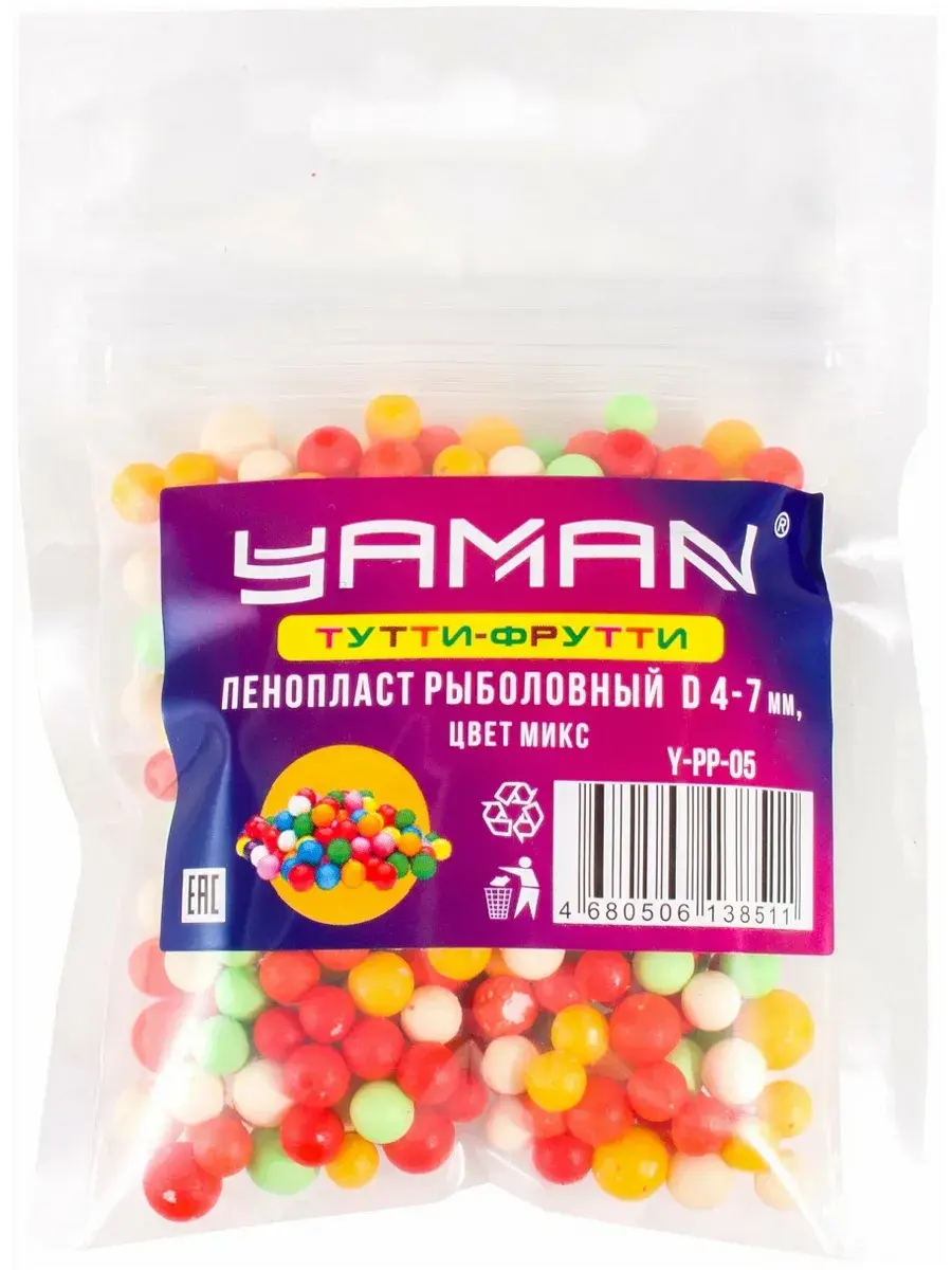 Пенопласт рыболовный Yaman Тутти-Фрутти d 4−7 мм цв микс — пенопластовые шарики с различными вкусами — популярная наживка среди современных рыбаков. Пенопластовые шарики приманивают рыбу, имитируя различные вкусы и запахи, которые свойственны природной наживке. К тому же, так как шарики сделаны из пенополистирола, лёгкого и плавучего материала, они способны поднять крючок со дна водоема, если необходимо, чтобы крючок с наживкой не опускался на дно водоема. Сами шарики имеют разнообразные размеры, запахи и отлично приманивает рыбу, а в комбинации с различными приманками даёт еще лучший эффект. Пенопластовые шарики прекрасная альтернатива для приманки рыбы вместо червя или зерна кукурузы.