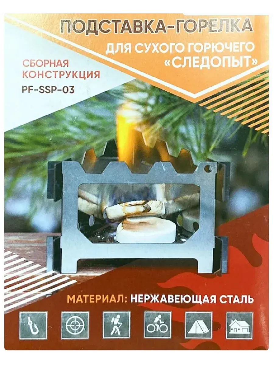 Разборная подставка-горелка для сухого горючего «Следопыт» предназначена для разогрева и приготовления пищи и напитков в различных погодных условиях с помощью таблеток сухого горючего. Скорость разогрева или приготовления пищи зависят от температуры окружающего воздуха, ветра и количества используемых для горения таблеток. Рекомендуется использовать от 1 до 4 таблеток. Конструкция подставок-горелок полностью разборная, при этом они занимает минимальное количество места в багаже. Подставки -горелки продаются разобранными в презентабельной картонной упаковке с европодвесом.