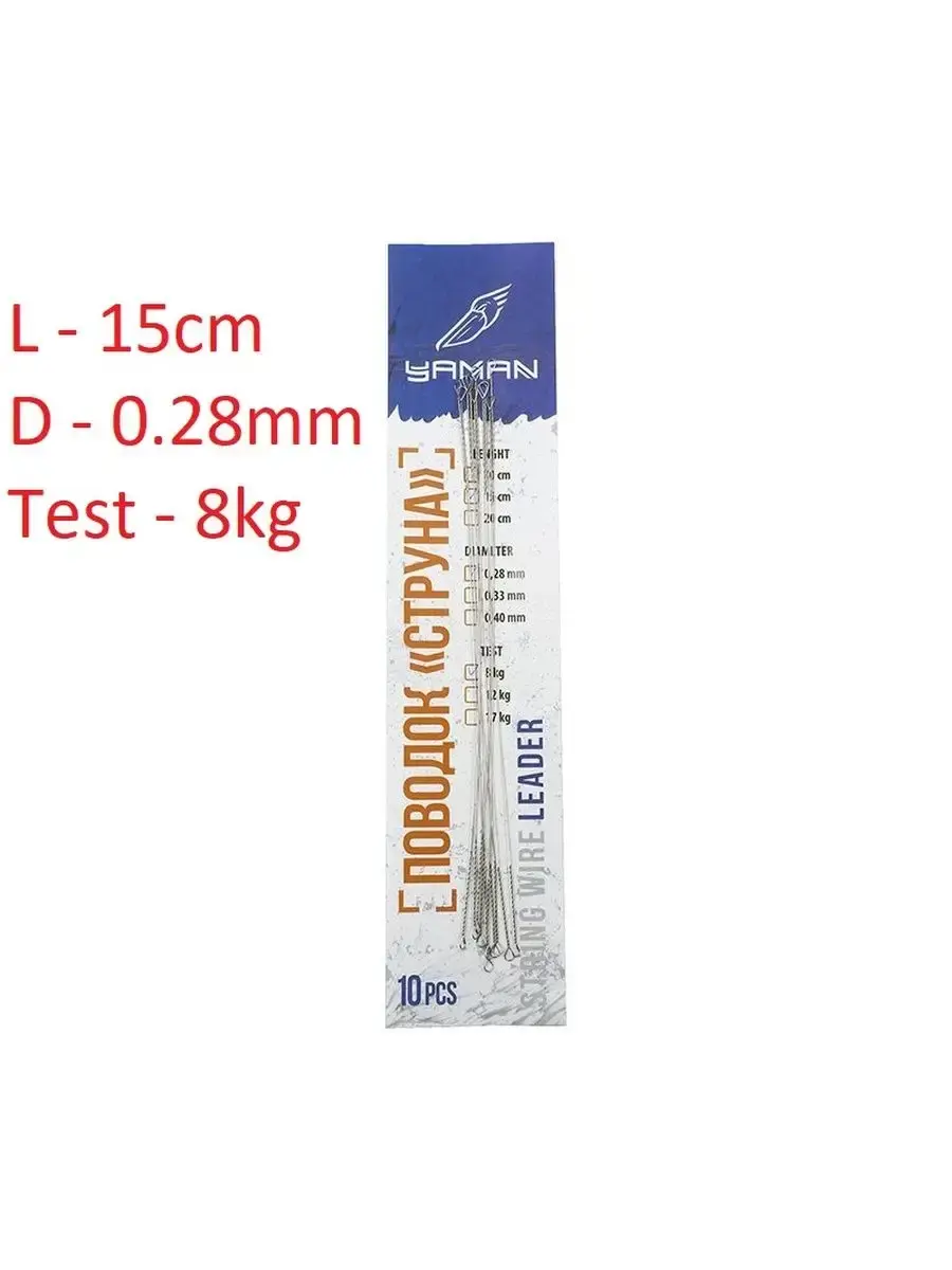 Поводок струна Yaman изготовлен из прочной нержавеющей проволоки и качественной фурнитуры. Скрутка со стороны лески имеет малый шаг для предотвращения попадания лески или плетенки между витков поводка. Скрутка ос стороны приманки имеет оптимальное соотношение длины и количества витков, что обеспечивает простоту монтажа приманки без потери прочности. Поводок является необходимым элементом оснастки при ловли зубастых хищников: щуки и судака.