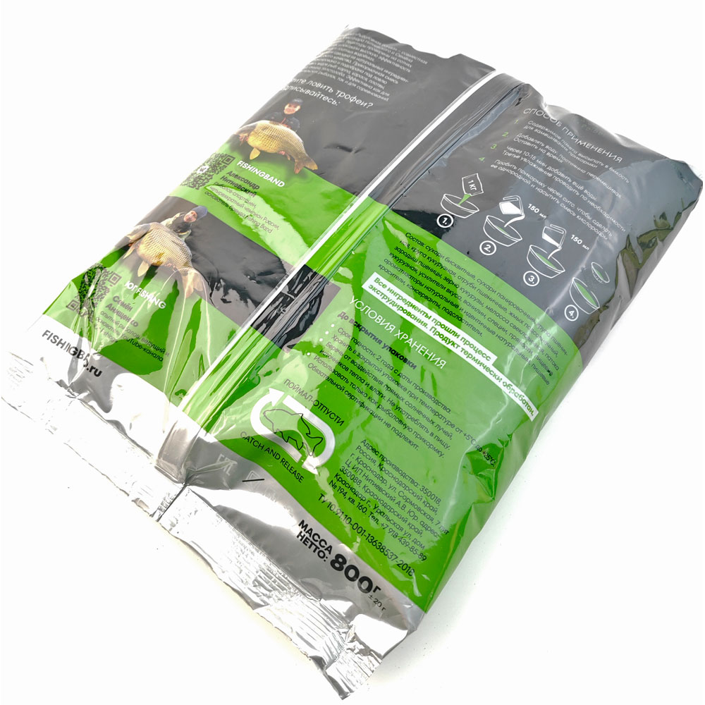 Прикормка имеет оптимальное содержание белка, аминокислот и аттрактивных веществ. Все ингредиенты прошли процесс экструдирования. Прикормочная смесь сбалансирована и подобрана под ловлю целевых видов рыб: карпа, карася, плотвы, леща, амура, толстолоба.