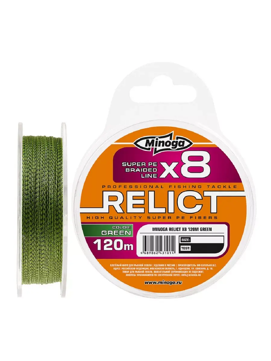 8 жильный плетёный шнур Minoga RELICT GREEN в размотке 120м Плетеный шнур Minoga RELICT GREEN Х8 – это серия восьмижильных плетеных шнуров, выполнен из сверхпрочного и гладкого материала, плетение состоит из восьми нитей, размоткой по 120 метров на катушке. Технология многослойного плетения делает этот шнур максимально прочным, сохраняя при этом его мягкость. Повышенная мягкость плетенки позволяет ей идеально сходить с катушки при забросе, а высокая чувствительность позволит вам молниеносно реагировать даже на самую осторожную поклевку.