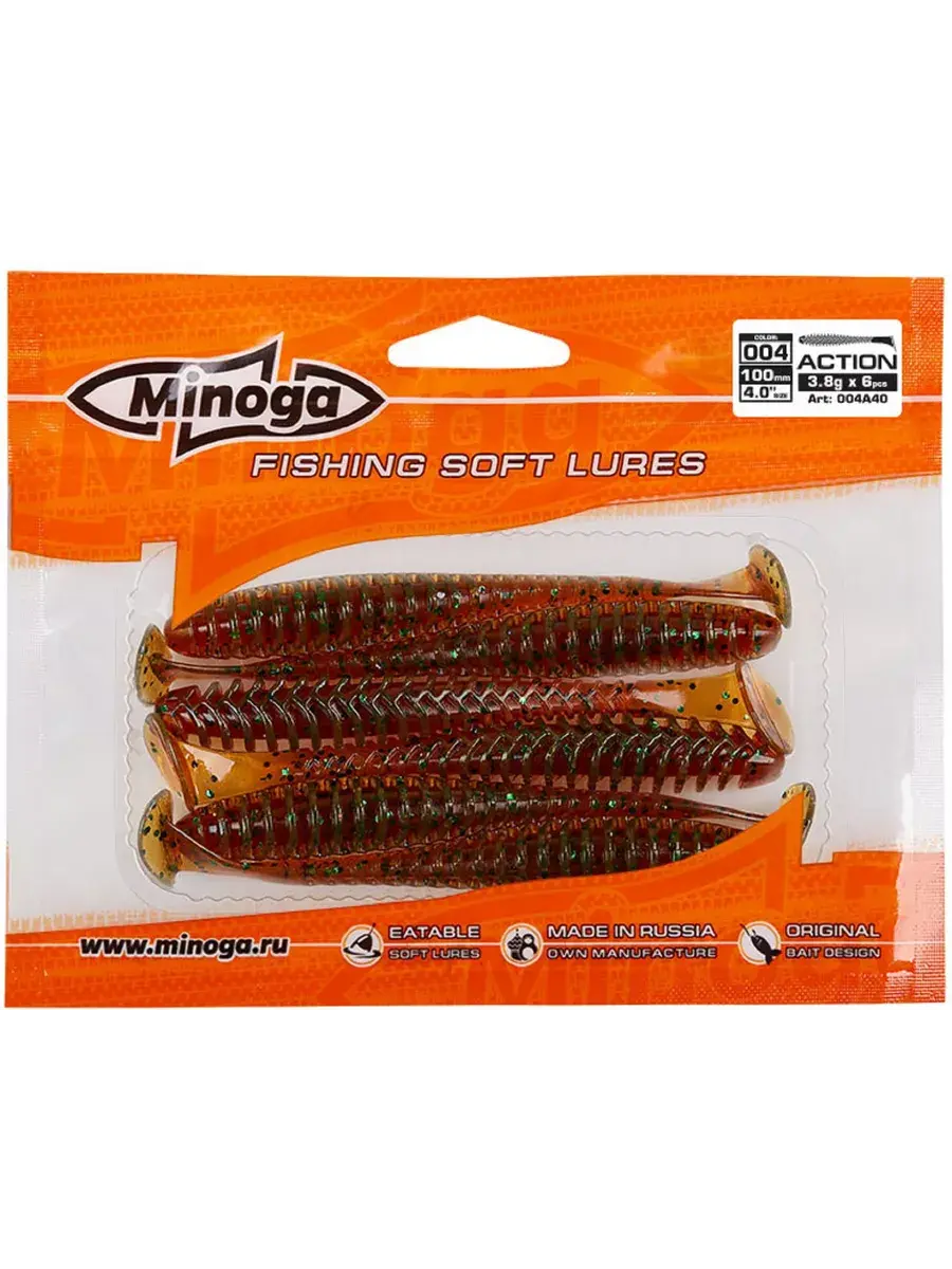 Виброхвост Minoga ACTION имеет удлиненное ребристое тело, которое создает шумы в водной среде, заставляя тем самым, обратить на себя внимание любому, даже самого пассивному хищнику. Приманка работает даже при самой медленной проводке! Action делается, как и все приманки MINOGA из мягкого съедобного силикона, с содержанием как вкусовой, так и ароматической добавки. Основным объектом ловли на данную приманку является окунь, судак и щука.