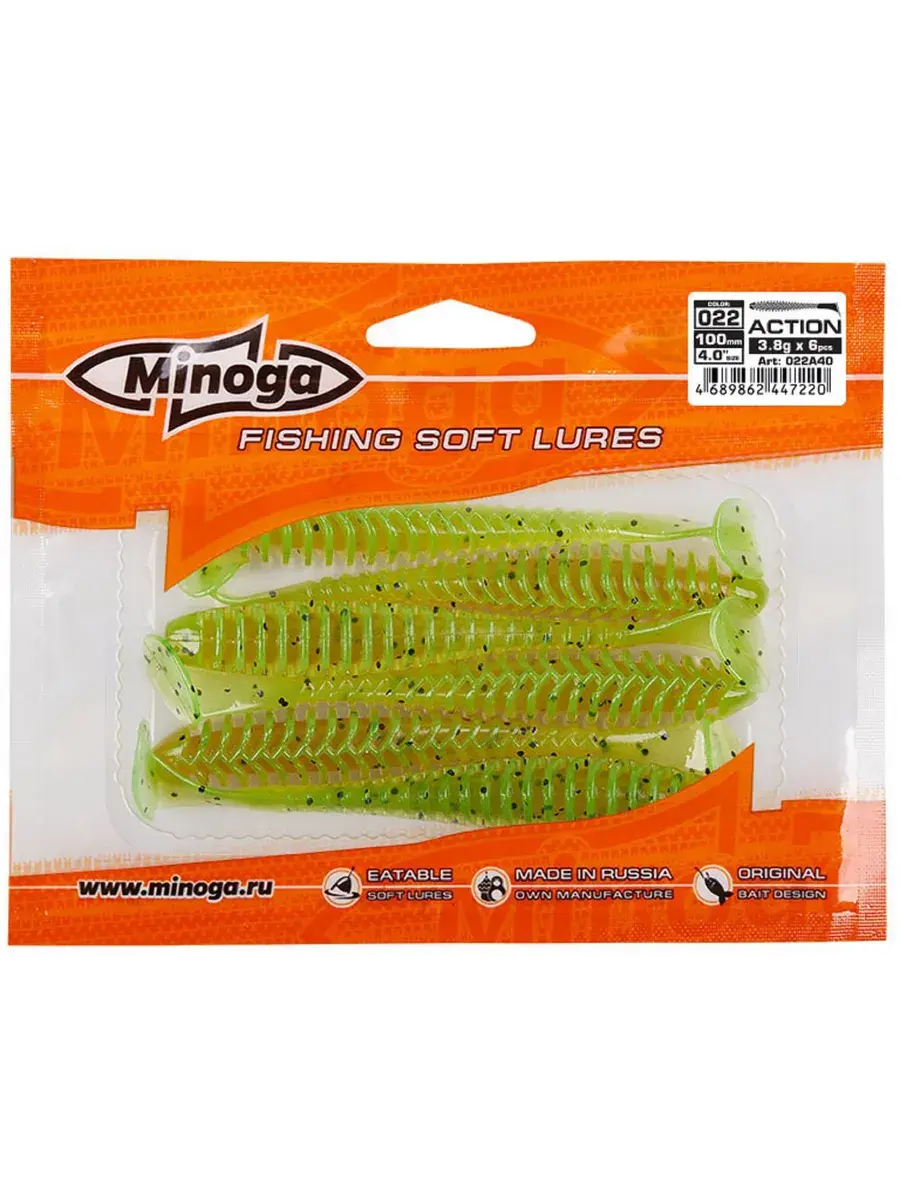 Виброхвост Minoga ACTION имеет удлиненное ребристое тело, которое создает шумы в водной среде, заставляя тем самым, обратить на себя внимание любому, даже самого пассивному хищнику. Приманка работает даже при самой медленной проводке! Action делается, как и все приманки MINOGA из мягкого съедобного силикона, с содержанием как вкусовой, так и ароматической добавки. Основным объектом ловли на данную приманку является окунь, судак и щука.