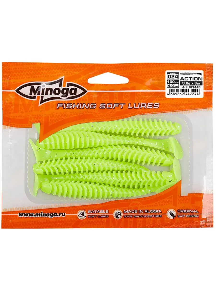 Виброхвост Minoga ACTION имеет удлиненное ребристое тело, которое создает шумы в водной среде, заставляя тем самым, обратить на себя внимание любому, даже самого пассивному хищнику. Приманка работает даже при самой медленной проводке! Action делается, как и все приманки MINOGA из мягкого съедобного силикона, с содержанием как вкусовой, так и ароматической добавки. Основным объектом ловли на данную приманку является окунь, судак и щука.