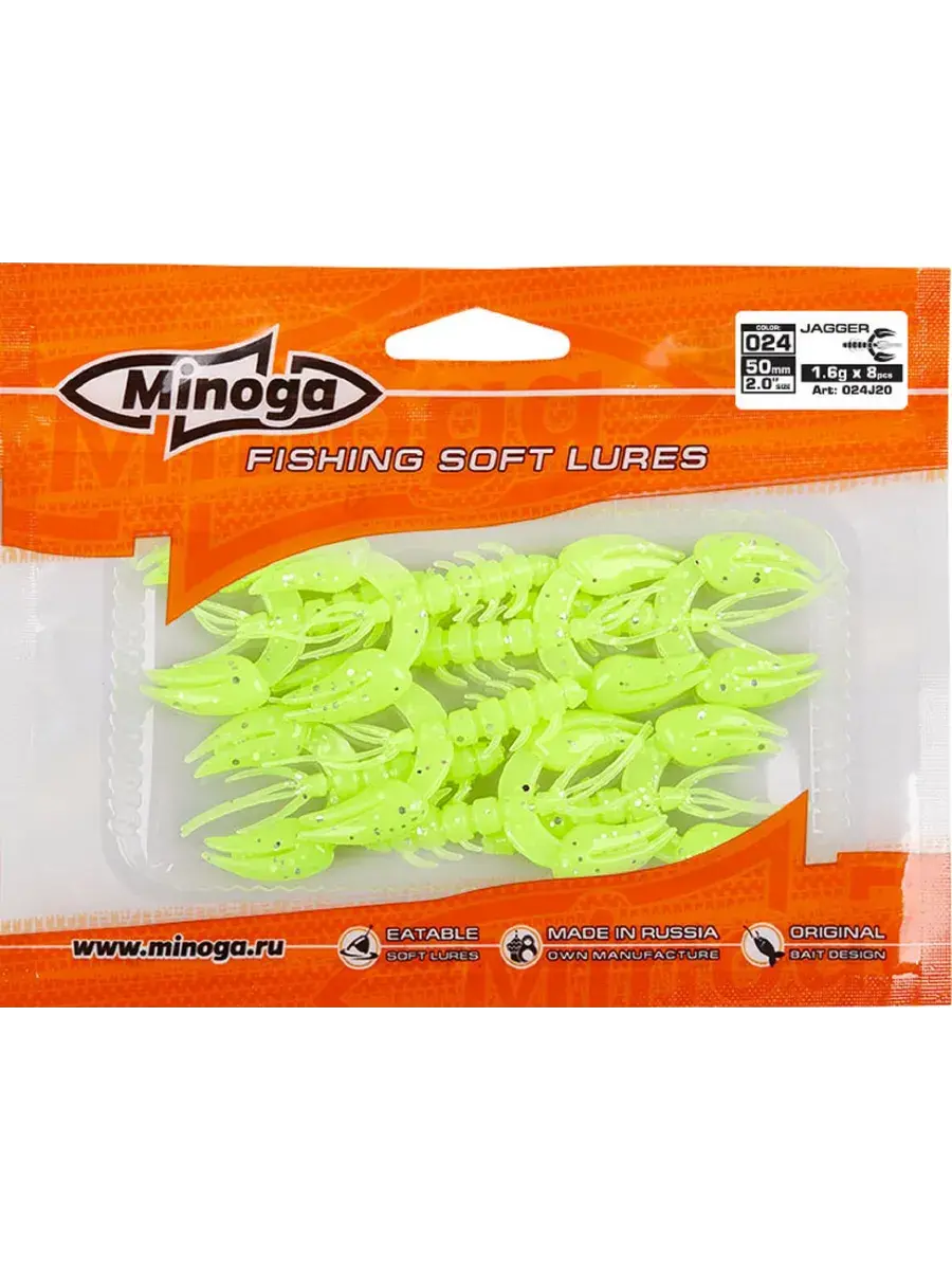 Рак Minoga Jagger имеет свою оригинальную игру клешнями, он заставит обратить на себя внимание любого, даже самого пассивного хищника. Приманка работает даже при самой медленной проводке! jagger делается, как и все приманки MINOGA из мягкого съедобного силикона, с содержанием как вкусовой, так и ароматической добавки. Основным объектом ловли на данную приманку является окунь, судак, сом и не редко щука