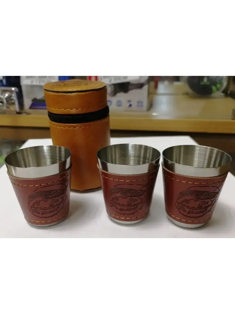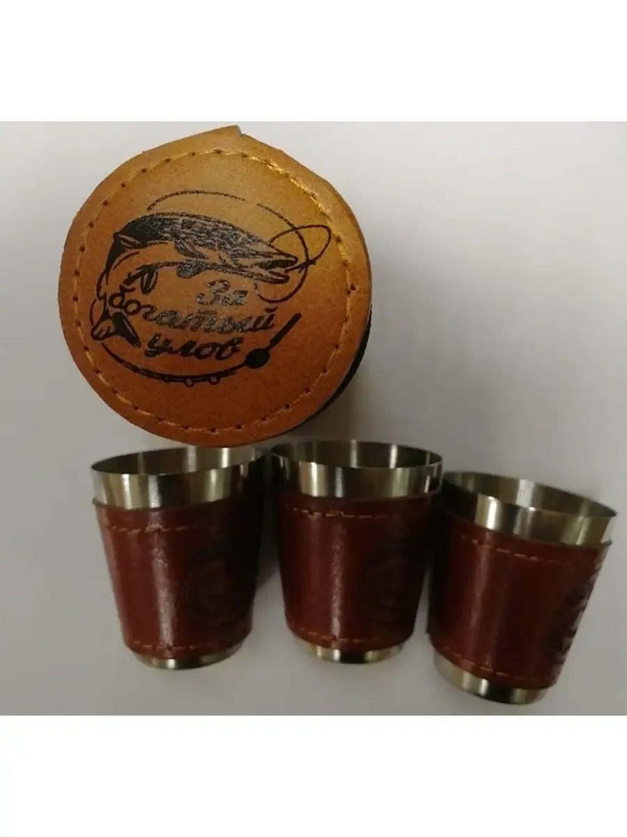 Набор стопок 30 мл "За богатый улов" 3шт A17 Helios. Набор из 3 стопок в кожаном чехле. Стопки декорированны полосой из искусственной кожи, с рисунком. Характеристики: Материал стопок нержавеющая сталь. Объем - 30 мл.