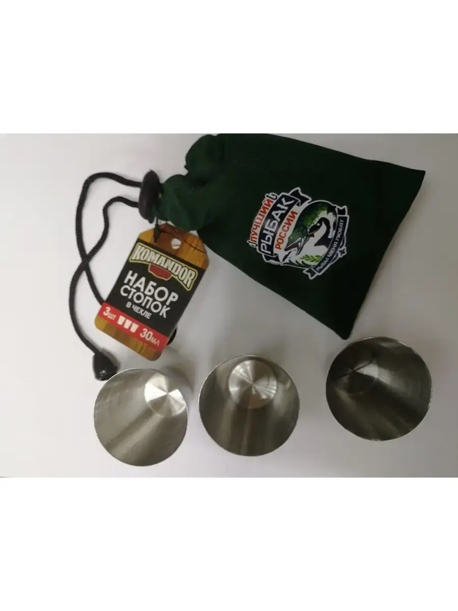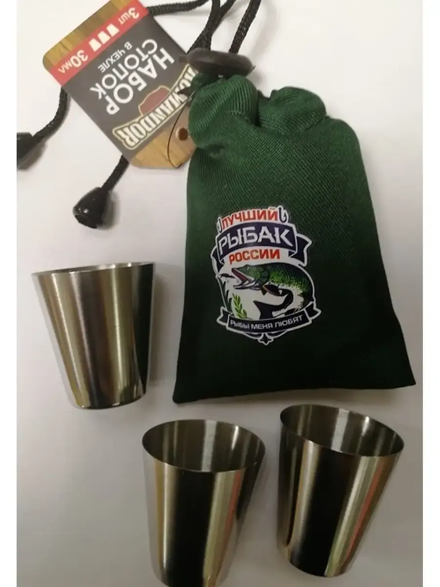 Набор стопок в мешке 30 мл Лучший рыбак России 3 шт Внутри чехла находится 3 небольших стаканчика из нержавеющей стали. Такой презент идеально подойдёт любителям походов и путешествий. Набор очень лёгкий и займёт минимум места. Мешочек затягивается, благодаря чему стопки не выпадут из рюкзака и не раскатятся по бардачку машины. Объем стопки - 30 мл.