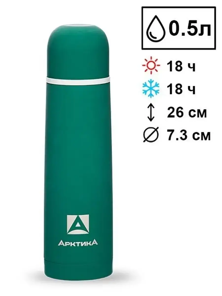 Термос Арктика (0,5 литра) с узким горлом классический, с резиновым "шёлковым" покрытием, зелёный, Резиновое напыление на корпусе -приятно держать в руках, не выскользнет из рук, не будет примерзать к ладоням в мороз, колба и корпус из нержавеющей стали марки 18/8, глухая пробка с термоизолятором и каналами для наливания в полуоткрытом положении, габариты 26х7,3 см, горлышко диаметр 40 мм, сохранение тепла 18 час, сохранение холода 18 час, вес 348 г.