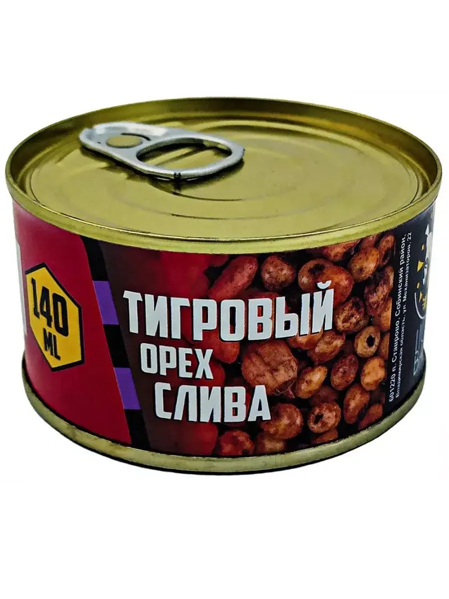 Тигровый орех – одна из самых популярных насадок и прикормок для ловли карпа. По своему составу орех является очень питательным и содержит большое количество полезных жиров, а также до 28% сахара, благодаря чему он имеет слегка сладковатый натуральный вкус. Это очень привлекает карпов и, порой, становится неоспоримым преимуществом даже в самых тяжелых условиях ловли. Небольшая по объему фасовка банки (140мл) может использоваться рыбаками, в качестве готовой насадки на волосяной монтаж. Для этого достаточно просверлить в одном или двух орешках тонким сверлом отверстия, либо проткнуть их сразу тонкой монтажной иглой, после чего Ваш монтаж готов. Насадку из тигрового ореха рекомендуется использовать на водоемах, где очень много мелкой рыбы, которая быстро разбивает даже самые твердые бойлы. Как раз в такой ситуации Вам на помощь придут именно тигровые орешки, а небольшая баночка не займет много места в вашем снаряжении, но зато эффективная и универсальная насадка будет всегда с Вами рядом. Жестяная банка 140мл с удобным кольцом для вскрытия. Срок годности: 3 года.