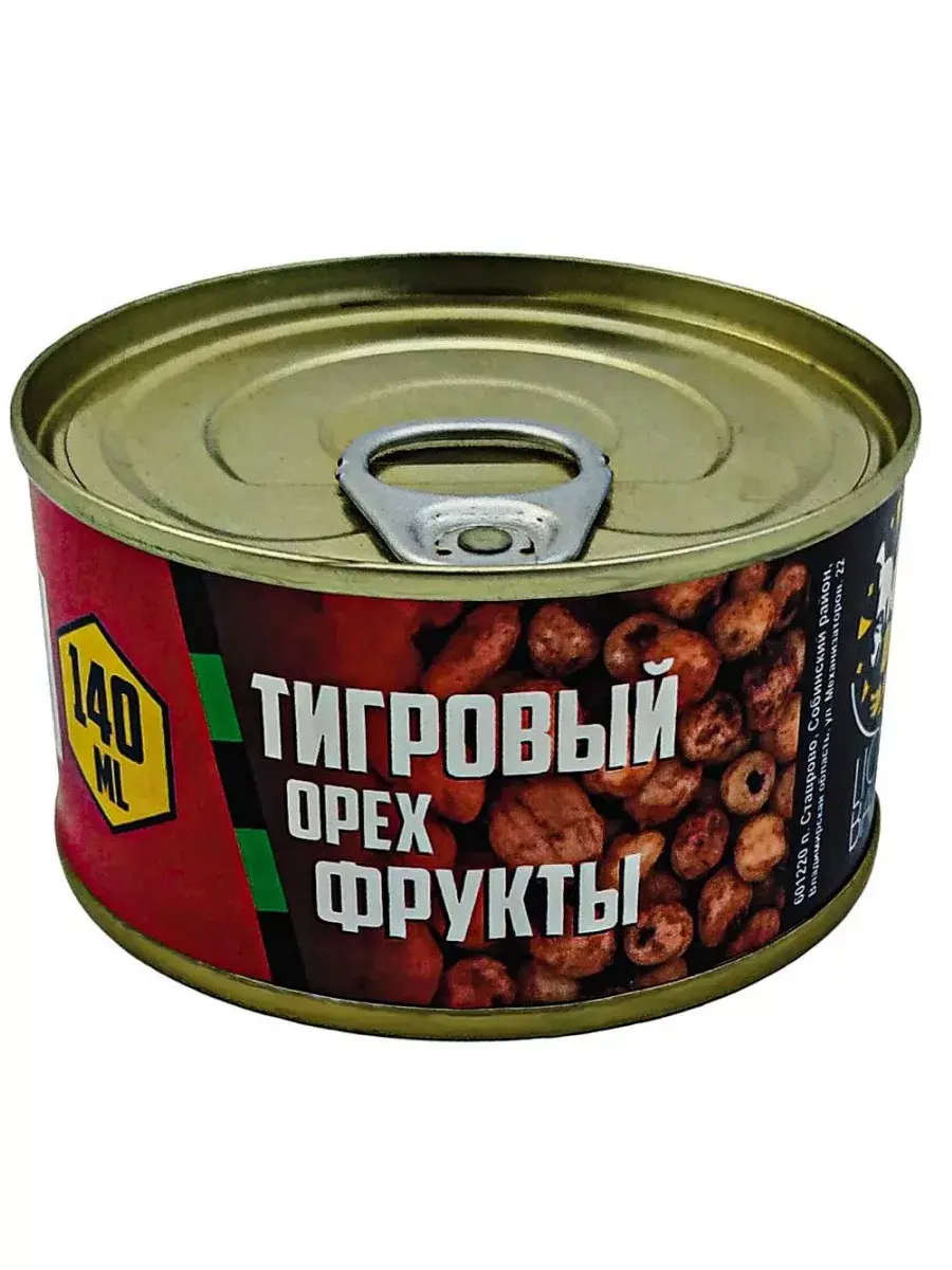 Тигровый орех – одна из самых популярных насадок и прикормок для ловли карпа. По своему составу орех является очень питательным и содержит большое количество полезных жиров, а также до 28% сахара, благодаря чему он имеет слегка сладковатый натуральный вкус. Это очень привлекает карпов и, порой, становится неоспоримым преимуществом даже в самых тяжелых условиях ловли. Небольшая по объему фасовка банки (140мл) может использоваться рыбаками, в качестве готовой насадки на волосяной монтаж. Для этого достаточно просверлить в одном или двух орешках тонким сверлом отверстия, либо проткнуть их сразу тонкой монтажной иглой, после чего Ваш монтаж готов. Насадку из тигрового ореха рекомендуется использовать на водоемах, где очень много мелкой рыбы, которая быстро разбивает даже самые твердые бойлы. Как раз в такой ситуации Вам на помощь придут именно тигровые орешки, а небольшая баночка не займет много места в вашем снаряжении, но зато эффективная и универсальная насадка будет всегда с Вами рядом. Жестяная банка 140мл с удобным кольцом для вскрытия. Срок годности: 3 года.