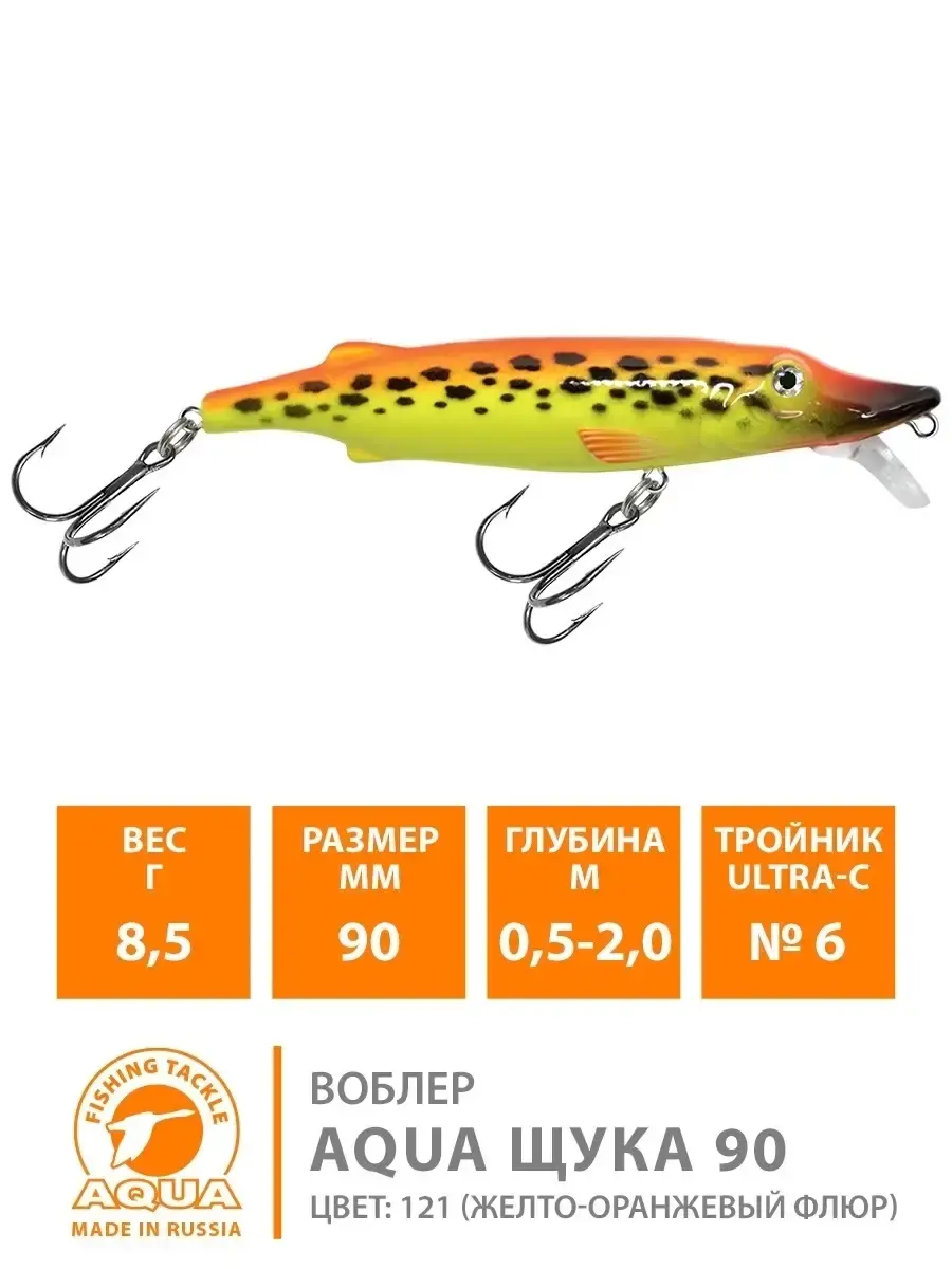 Воблер для рыбалки AQUA ЩУКА – это воблер с рабочей глубиной от 0,5 до 2,0m, который имитирует форму и расцветку щуки, такие приманки давно и на законном основании относятся к наиболее эффективным приманкам для ловли любой хищной рыбы, но особенно самой щуки, ведь для неё, лучше молоди плотвы, густеры или окуня, может быть только молодь ее собственного вида.