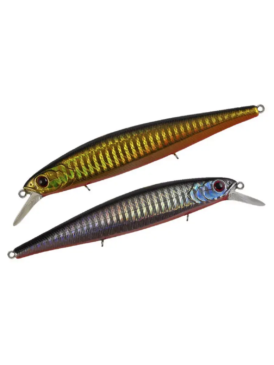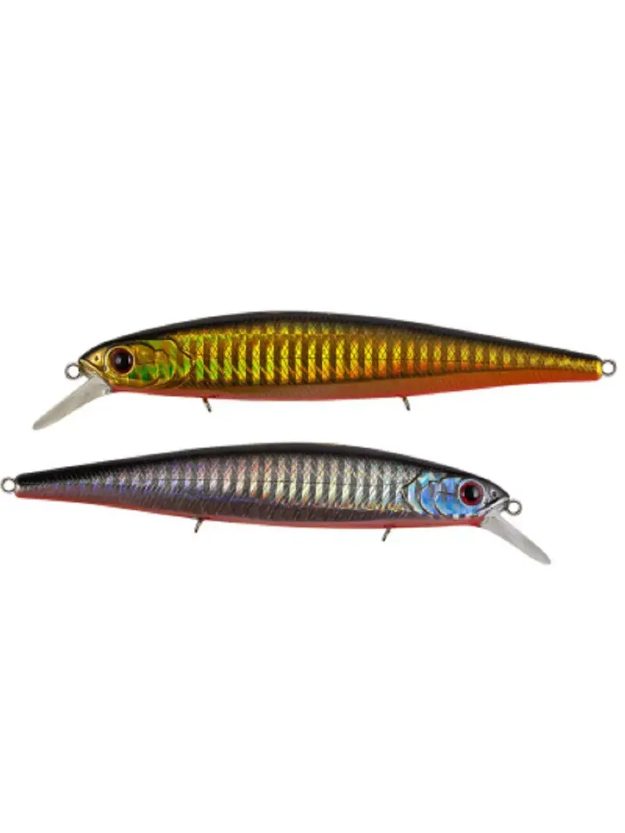 Особенности дизайна: FLIRT 115SP имеет две, разделенные боковой линией, рельефные фактуры поверхности. Верхняя часть (спинка и бока) выполнена в виде ромбовидных насечек - чешуек, нижняя (вплоть до брюшка) в виде косых насечек. Головная часть воблера рельефно имитирует жаберные крышки. Объемные 3D глаза завершают реалистичный дизайн приманки. FLIRT 115SP имеет систему дальнего заброса и баланса , а так же встроенную шумовую камеру с мелкими шелестящими шариками. Приманка оснащена тремя тройниками VMC BN. Качество лако-красочного покрытия соответствует всем современным требованиям. Средне-размерный минноу нейтральной плавучести для ловли на глубинах 2-2,5 метра. Благодаря системе дальнего заброса и общей геометрии FLIRT 115SP летит на 35+ метров. На равномерной проводке воблер имеет очень приятную широкоамплитудную, и при этом низкочастотную собственную игру. При использовании стоп энд гоу воблер в паузе медленно всплывает, немного покачиваясь. На самой протяжке бликует и немного показывает бока. На рывковой анимации FLIRT 115SP ведет себя очень отзывчиво и послушно. Если анимировать его короткими, но достаточно резкими рывками, то воблер разворачивается на 90+ градусов практически на месте, в момент самого рывка активно показывает бока. В общем, поле для экспериментов и творчества в рывковой анимации FLIRT 115SP обширно, и каждый найдет для себя самый уловистый вариант твичинга. При всех вариантах анимации воблер отлично держит заданный горизонт заглубления. FLIRT 115SP отличный воблер для охоты за щукой над коряжниками и кормовыми поливами. Будет востребован и при ночной ловле судака. Наличие поводка на анимацию влияния не оказывает.