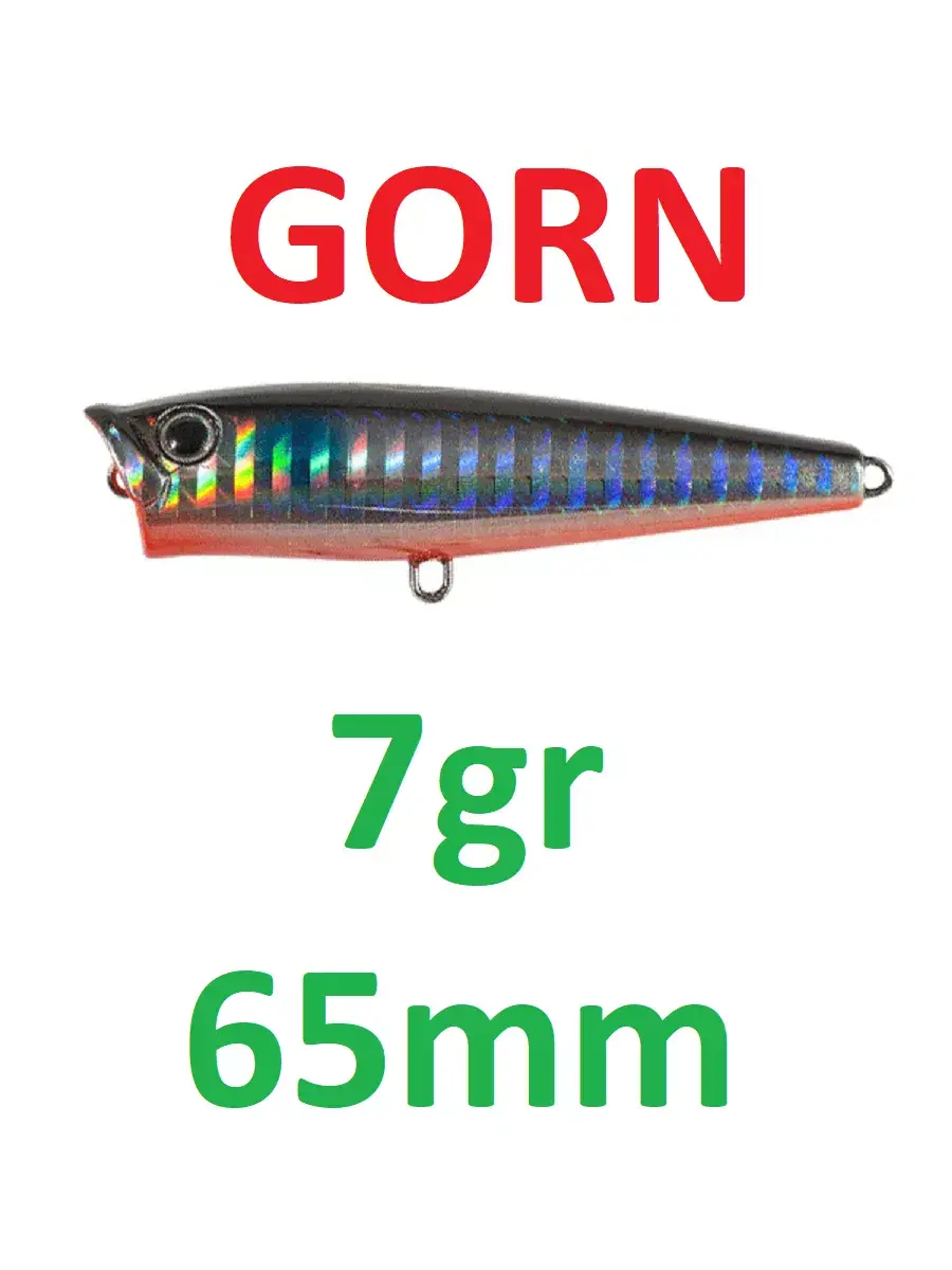 Поппер TsuYoki GORN 65F относится к приманкам так называемого " top water" класса, то есть приманкам работающим на поверхности воды и вызывающих поклевки хищной рыбы за счет своих акустических данных. Благодаря обтекаемой форме корпуса и внутреннему устройству и не смотря на свой вес в 7 грамм, поппер GORN 65F летит далеко и точно. В воде занимает вертикальное положение - головой вверх, что дает рыболову, не обделенному фантазией, массу вариантов проводки. Сам по себе GORN 65F является " быстрым" поппером, легко подымается, по горизонтали не рыщет. Регулируя высоту кончика удилища можно добиться разных звуков и эффектов. Рекомендуем оснащать поппер легким, но жестким поводком. Основными жертвами данной модели становятся щука, окунь и жерех. Причем окунь и жерех не только котловой, но и одиночный. Оснащен крючками фирмы VMC, комплектом силовых заводных колец, является прототипом Yo-Zuri 3D Popper.