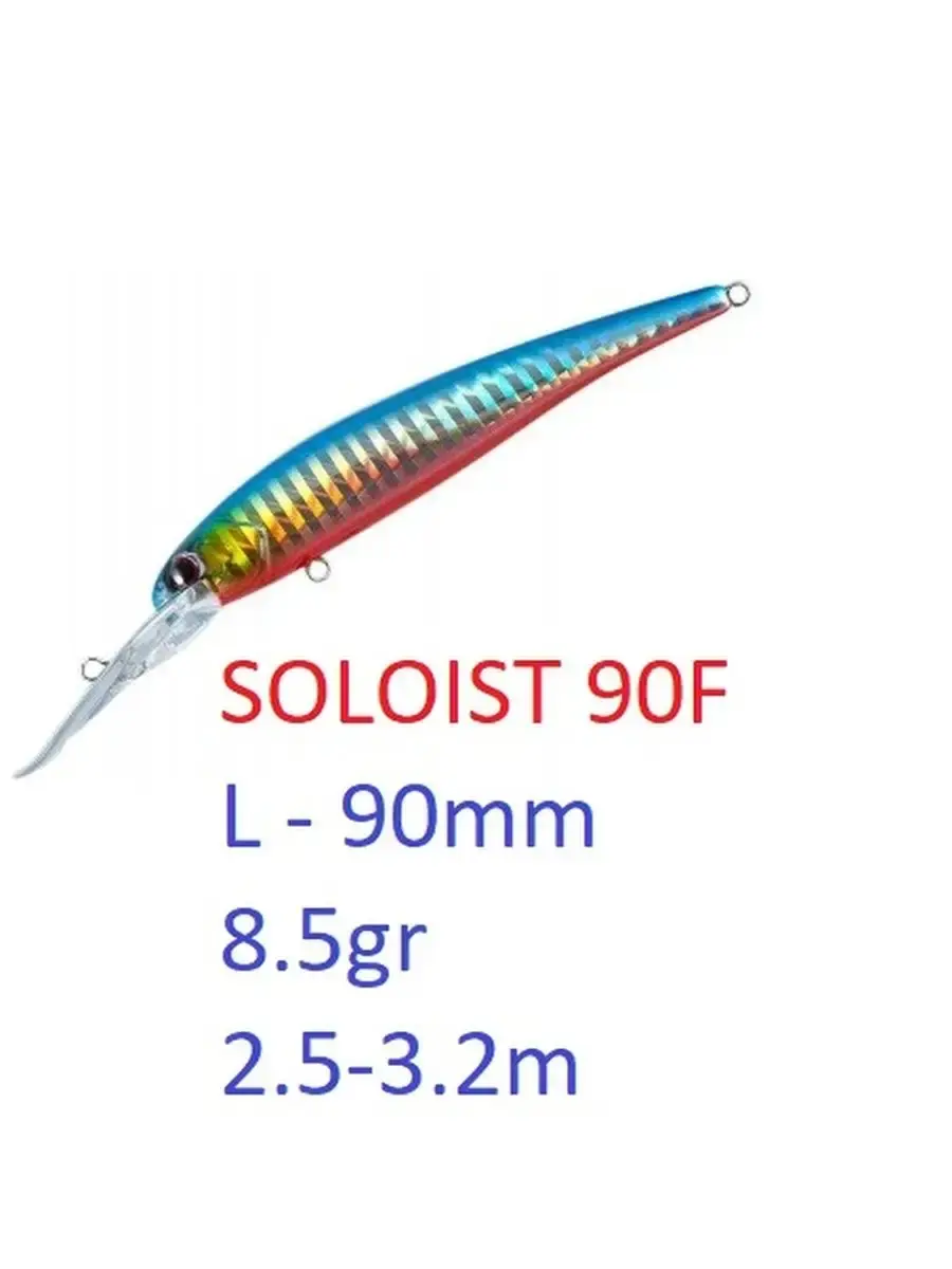Минноу для ловли троллингом на неоднородном рельефе и свалах с глубинами до 5 метров. Основные трофеи судак,щука,сом.SOLOIST 90F имеет систему баланса, шары которой выполняют функцию шумового сопровождения, создавая дополнительный фактор привлечения для хищников. Воблер оснащен мощной фурнитурой, силовыми заводными кольцами и двумя тройниками.При буксировке с помощью катера (троллинге) SOLOIST 90F совершает акцентированные колебания, издалека привлекающие хищников и провоцирующие их на поклевку.