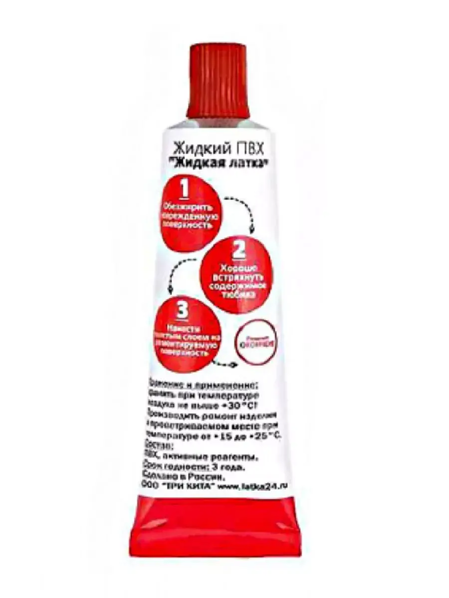 Современное технологичное решение для быстрого и надежного ремонта изделий из ПВХ (в том числе надувных лодок).Теперь Вам не придется искать латку из похожего материала, чтобы заклеить поврежденные матрас или лодку. Достаточно нанести несколько капель на прокол или порез.За счет уникального состава на основе ПВХ и специальных активных реагентов «Жидкая латка» при нанесении на прокол или порез проникает в наружный слой ремонтируемого изделия, создает новые химические связи внутри материала и повышает прочность соединения. В отличие от различных клеев «Жидкая латка» не боится ультрафиолетового излучения, и сохраняет все свойства основного материала: изделие будет так же легко сгибаться даже на морозе, сохранив свои первоначальные прочность и эластичность.